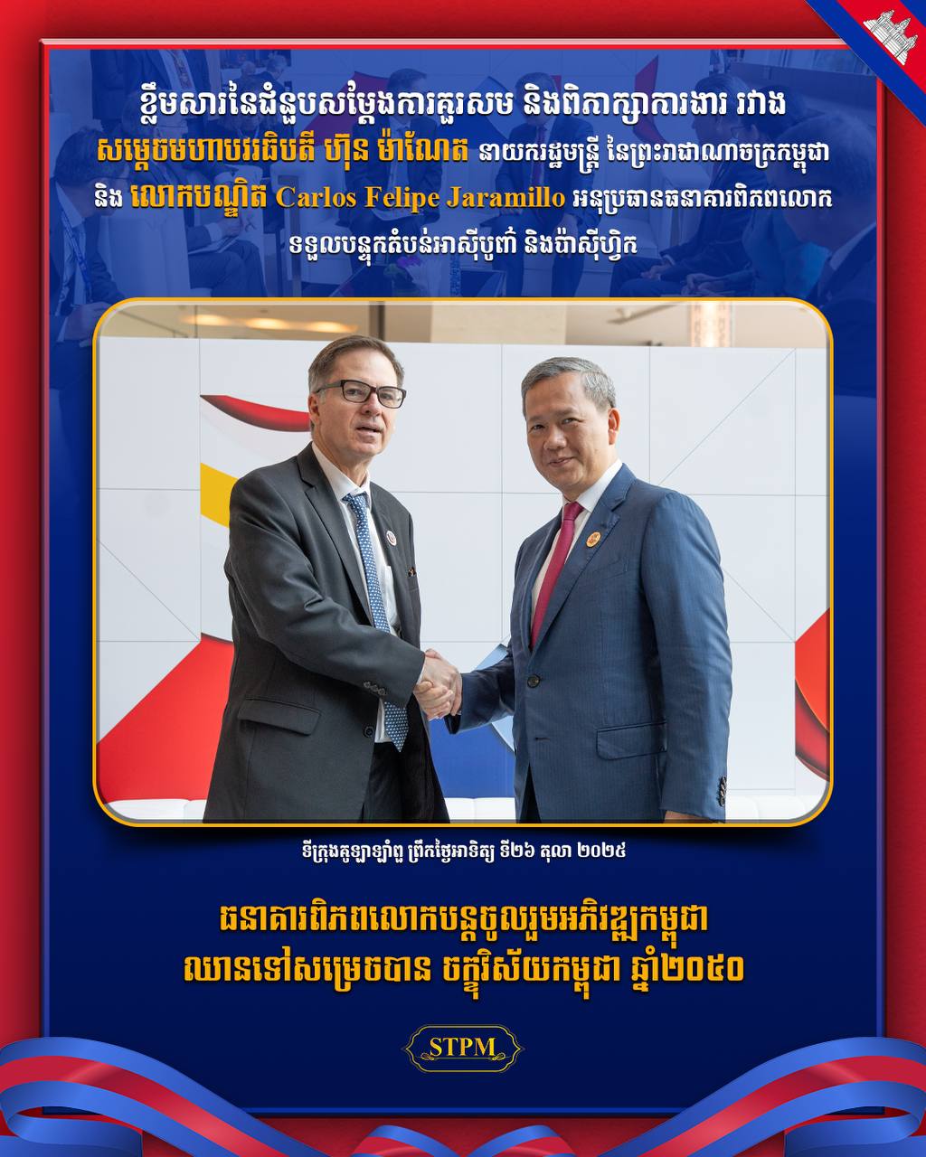 នាថ្ងៃទី២៦ ខែតុលា ឆ្នាំ២០២៥, សម្តេចមហាបវរធិបតី ហ៊ុន ម៉ាណែត នាយករដ្ឋមន្រ្តី នៃព្រះរាជាណាចក្រកម្ពុជា អនុញ្ញាតឱ្យ លោកបណ្ឌិត Carlos Felipe Jaramillo អនុប្រធានធនាគារពិភពលោក ទទួលបន្ទុកតំបន់អាស៊ីបូព៌ា និងប៉ាស៊ីហ្វិក ក្នុងជំនួបសម្តែងការគួរសម និងពិភាក្សាការងារ ក្នុងឱកាសចូលរួមកិច្ចប្រជុំ កំពូលអាស៊ាន លើកទី៤៧ និងកិច្ចប្រជុំកំពូលពាក់ព័ន្ធ នៅទីក្រុងគូឡាឡាំពួ ប្រទេសម៉ាឡេស៊ី ពីថ្ងៃទី២៦-២៨ ខែតុលា ឆ្នាំ២០២៥។