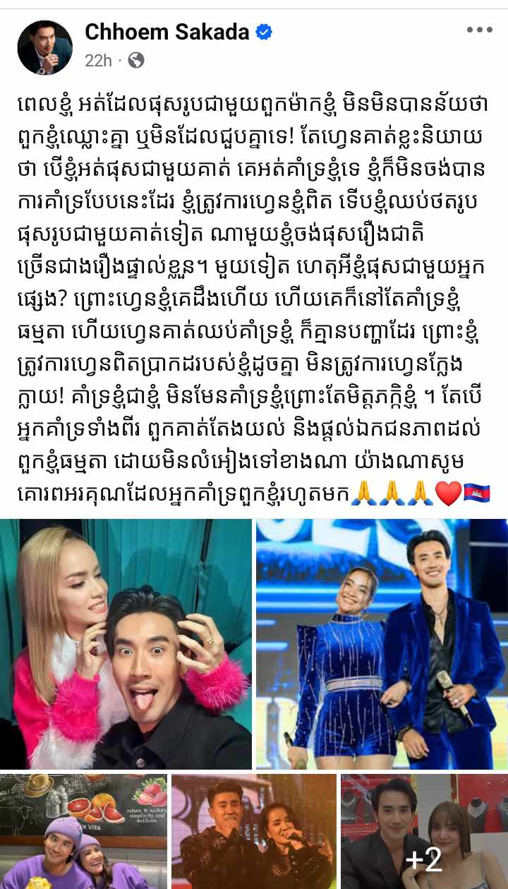 លោកបន្តថា មួយទៀត ហេតុអីខ្ញុំផុសជាមួយអ្នកផ្សេង? ព្រោះហ្វេនខ្ញុំគេដឹងហើយ ហើយ គេក៏នៅតែគាំទ្រខ្ញុំធម្មតា ហើយហ្វេនគាត់ឈប់គាំទ្រខ្ញុំ ក៏គ្មានបញ្ហាដែរ ព្រោះខ្ញុំត្រូវការហ្វេនពិតប្រាកដរបស់ខ្ញុំដូចគ្នា មិនត្រូវការហ្វេនក្លែងក្លាយ! គាំទ្រខ្ញុំជាខ្ញុំ មិនមែនគាំទ្រខ្ញុំព្រោះតែមិត្តភក្តិខ្ញុំ ។ តែបើអ្នកគាំទ្រទាំងពីរ ពួកគាត់តែងយល់ និងផ្ដល់ឯកជនភាពដល់ពួកខ្ញុំធម្មតា ដោយមិនលំអៀងទៅខាងណា យ៉ាងណាសូមគោរពអរគុណដែលអ្នកគាំទ្រពួកខ្ញុំរហូតមក ។