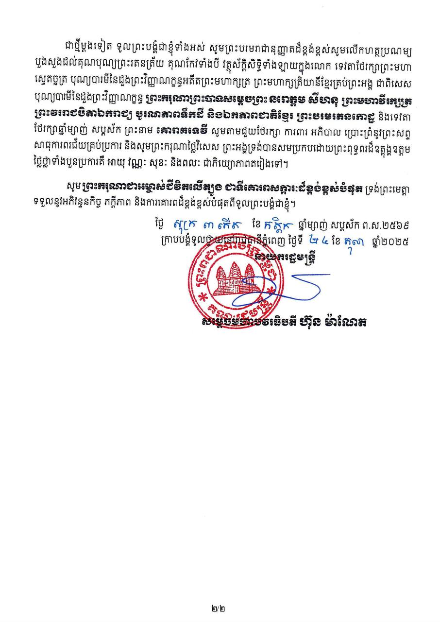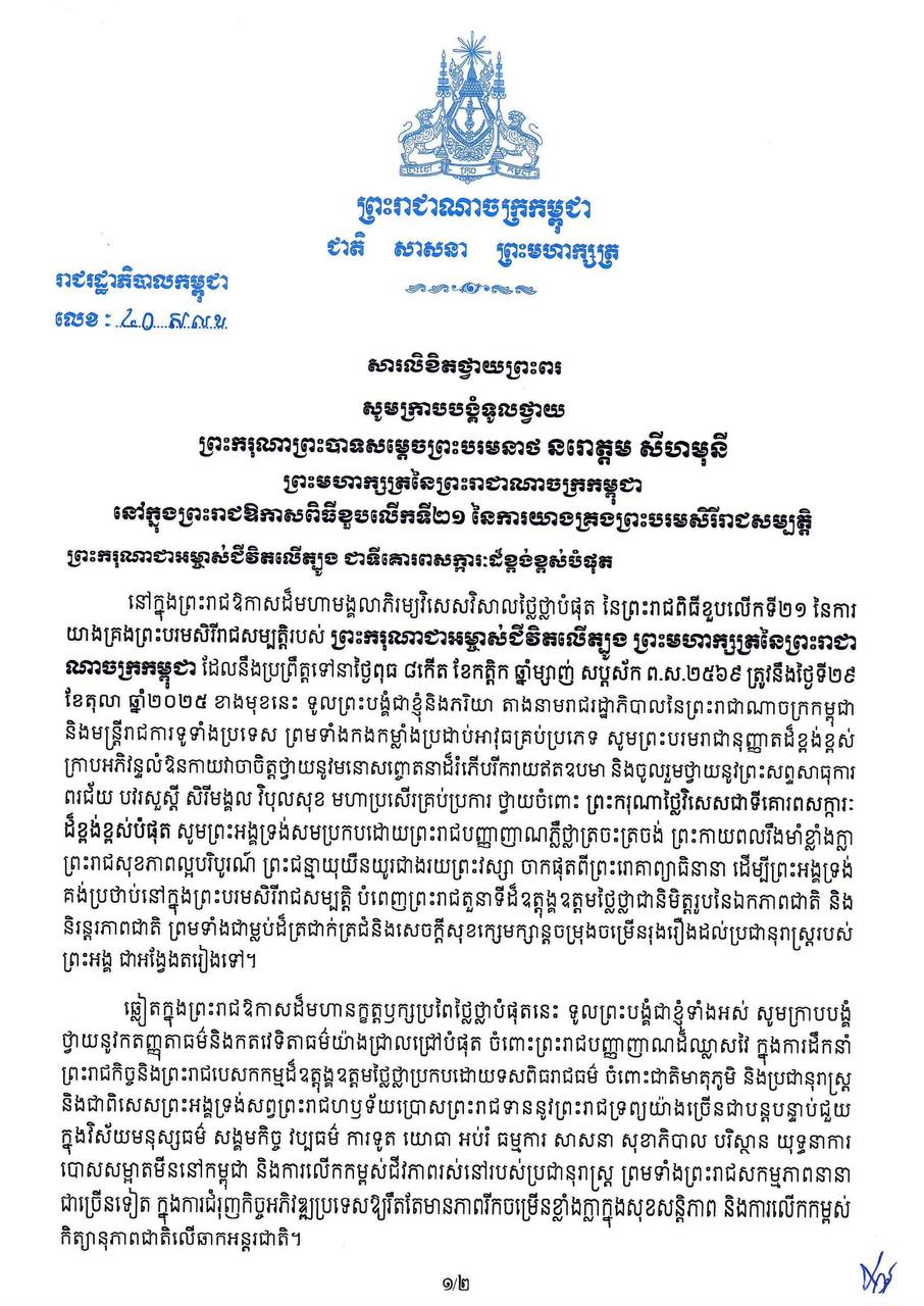 សារលិខិតថ្វាយព្រះពរ ព្រះករុណាព្រះបាទសម្តេចព្រះបរមនាថ នរោត្តម សីហមុនី ព្រះមហាក្សត្រនៃព្រះរាជាណាចក្រកម្ពុជា នៅក្នុងព្រះរាជឱកាសពិធីខួបលើកទី២១ នៃការយាងគ្រងព្រះបរមសិរីរាជសម្បត្តិ ៕