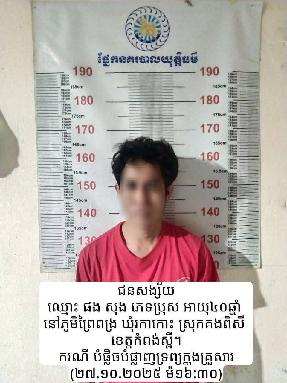 នគរបាលស្រុកគងពិសី បានឱ្យដឹងថា បុរសជាប្តី ដែលនគរបាលឃាត់ខ្លួនឈ្មោះផន សុង ភេទប្រុសអាយុ៣៨ ឆ្នាំ រស់នៅក្នុងភូមិព្រៃពង្រ ឃុំរកាកោះ ស្រុកគងពិសី ខេត្តកំពង់ស្ពឺ ។