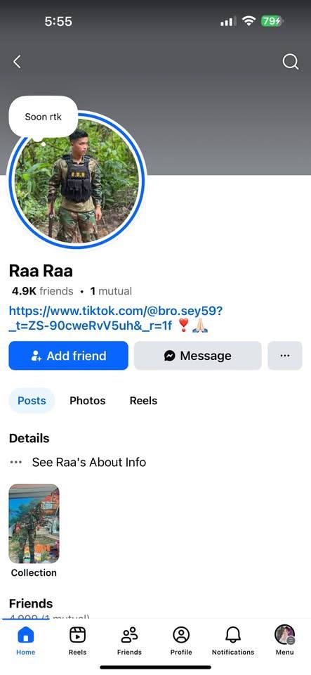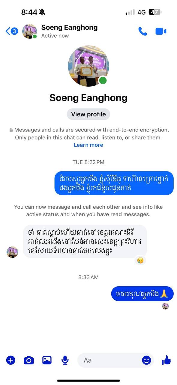 ប្រភពព័ត៌មានបានបញ្ជាក់ថា គាត់បានផុតហេីយ ជួបគ្រោះថ្នាក់ចរាចរណ៍កាលពីម្សិលមិញ គាត់គឺជាទាហានឈរជេីងនៅច្រកអានសេះ ដោយប្រទេសជាតិមានសុខសន្តិភាព មេរំសាយហេីយអោយមកលេងគ្រួសារតែអកុសលជួបគ្រោះថ្នាក់នៅខេត្តស្ទឹងត្រែង កាល ពីម្សិលមិញ សូមចូលរួមរំលែកទុក្ខនៃគ្រួសារសពផង ។