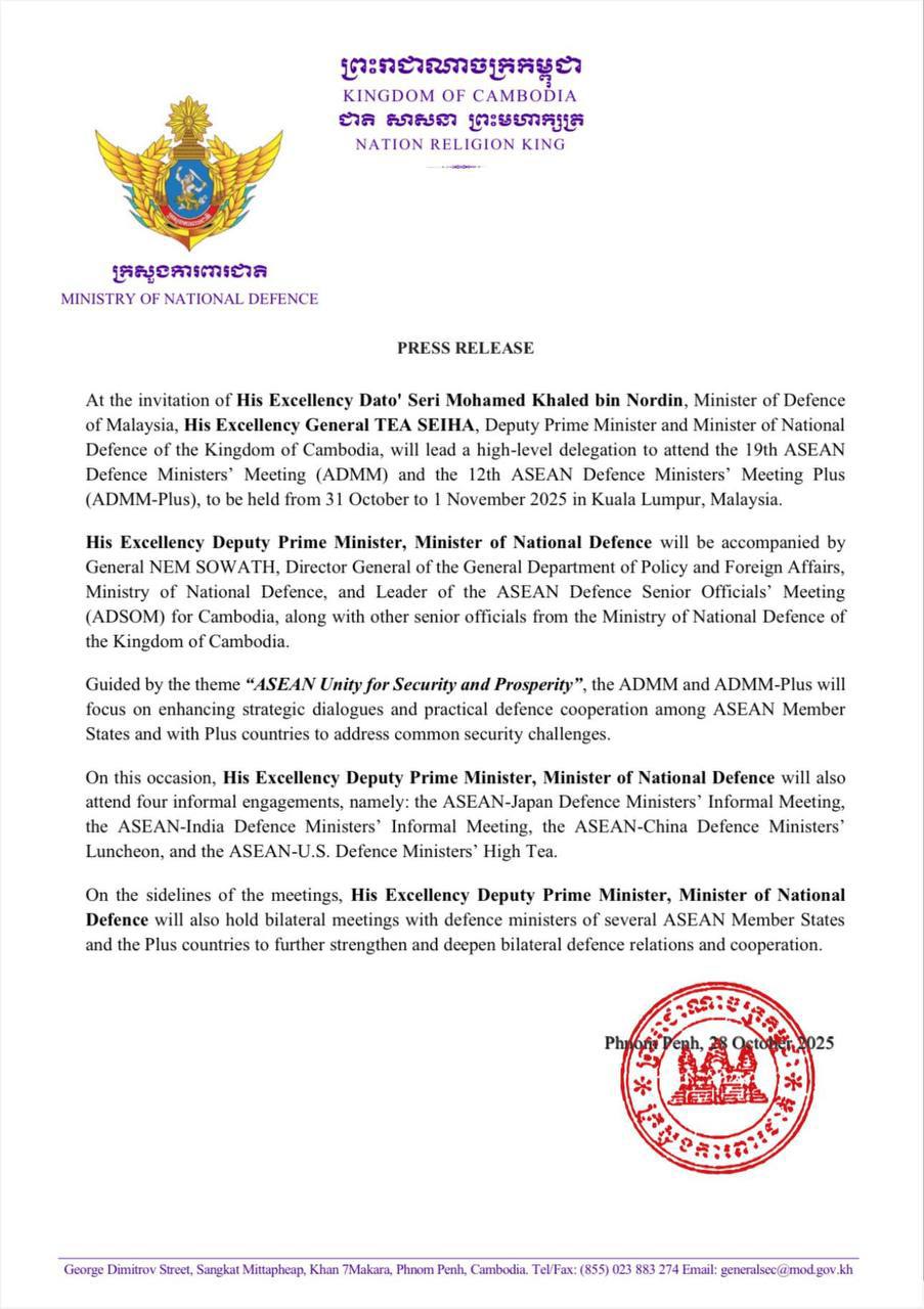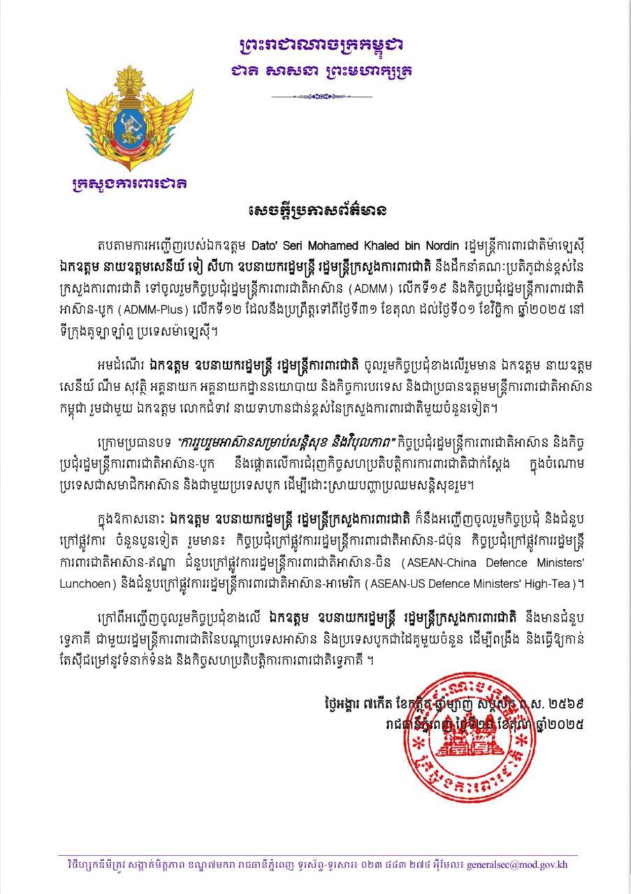 រដ្ឋមន្ត្រីការពារជាតិកម្ពុជា នឹងចូលរួមកិច្ចប្រជុំរដ្ឋមន្ត្រីការពារជាតិអាស៊ាន (ADMM) លើកទី១៩ និងកិច្ចប្រជុំរដ្ឋមន្ត្រីការពារជាតិអាស៊ាន-បូក (ADMM-Plus) លើកទី១២ នៅប្រទេសម៉ាឡេស៊ី៕