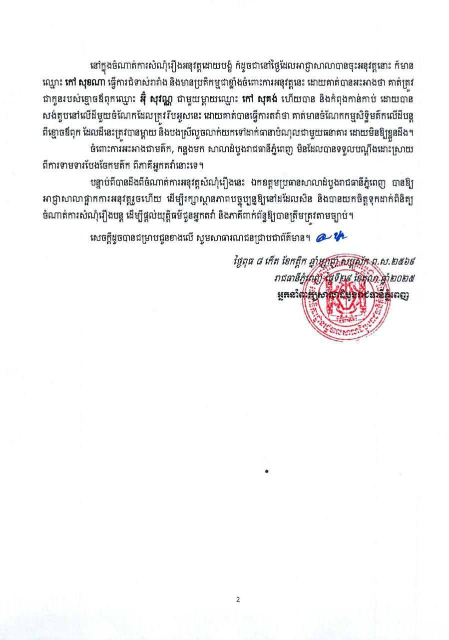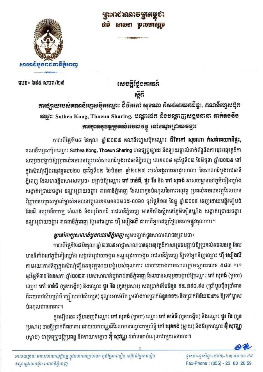 ប្រធានសាលាដំបូងរាជធានីភ្នំពេញ បញ្ជាឱ្យ អាជ្ញាសាលា ផ្អាកការអនុវត្តដីកា និងឱ្យពិនិត្យឡើងវិញ ដើម្បីផ្តល់យុត្តិធម៌ដល់អ្នកតវ៉ា ពាក់ព័ន្ធការចុះរឹបអូសផ្ទះស្រ្តីម្នាក់នៅខណ្ឌជ្រោយចង្វា ៕