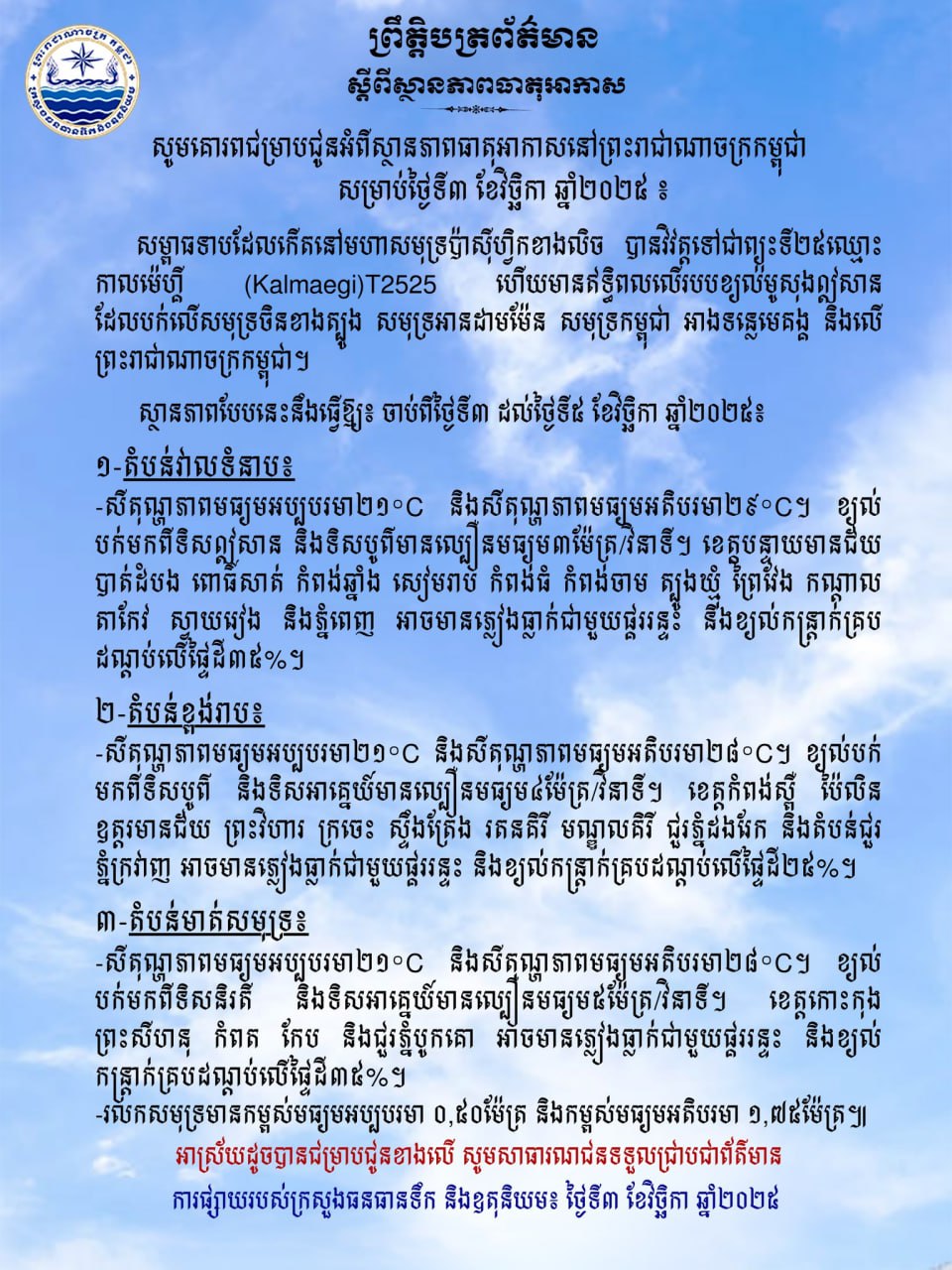 ក្រសួងធនធានទឹក ជូនដំណឹងអំពីស្ថានភាពធាតុអាកាសនៅកម្ពុជា សម្រាប់ថ្ងៃទី៣ ខែវិច្ឆិកា ឆ្នាំ២០២៥