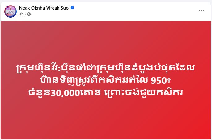លោកបានសរសេបញ្ជាក់យ៉ាងដូច្នេះថា «ក្រុមហ៊ុនវីរ:ប៊ុនថាំជាក្រុមហ៊ុនដំបូងបំផុត ដែលហ៊ានទិញស្រូវពីកសិកររតំលៃ ៩៥០រៀល ចំនួន៣០ ០០០តោន ព្រោះចង់ជួយកសិករ។ ស្រូវធ្លាក់ថ្លៃគួររួមគ្នាគិត រួមគ្នាធ្វើ រួមគ្នាដោះស្រាយ ជាជាងរួមគ្នាបន្ទោសតែក្រសួងកសិកម្ម»។