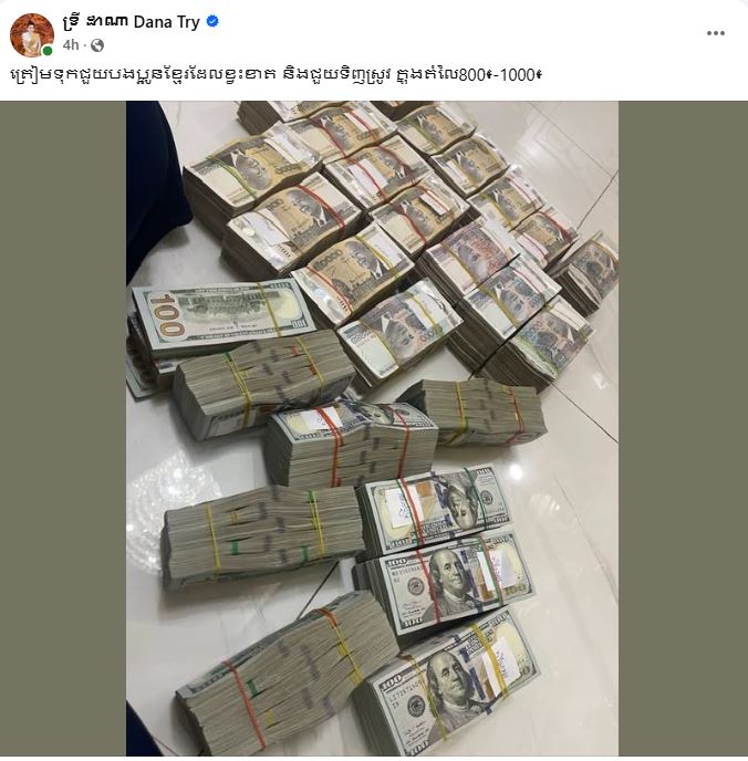 ចំណែកលោកស្រី ទ្រី ដាណា ដែលគេស្គាល់ថា អ្នកលក់អនឡាញល្បីឈ្មោះមួយរូបនៅកម្ពុជា ក៏ប្រកាសជួយទិញស្រូវកសិករ ក្នុងតម្លៃពី៨០០រៀលទៅ១០០០រៀល ក្នុងមួយគីឡូលក្រាមផងដែរ។
