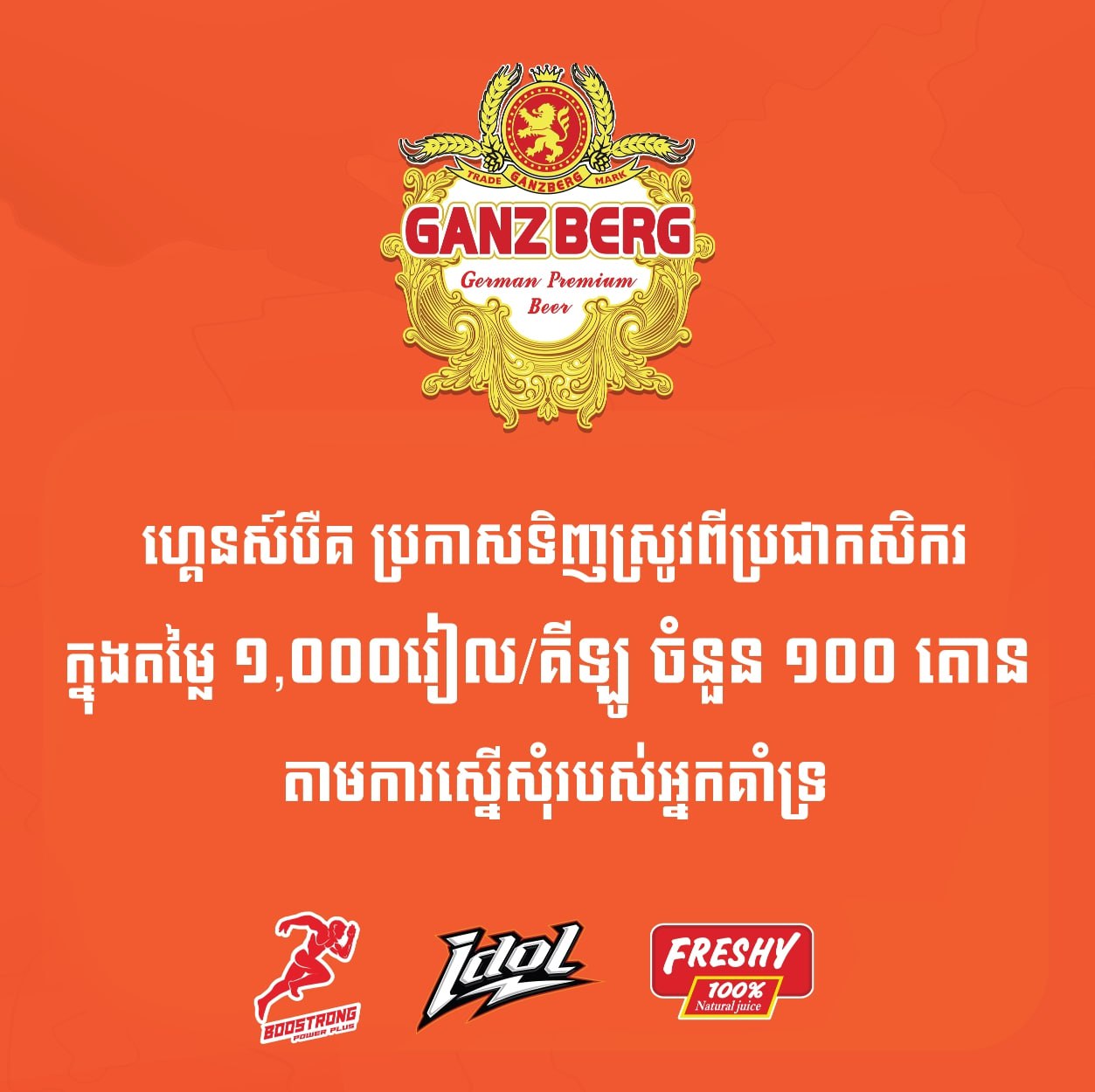 រីឯក្រុមហ៊ុន ស្រាបៀរ GANZBERG ដែលជាក្រុមហ៊ុនផលិតក្នុងស្រុកមួយ បានប្រកាសពីគំនិតផ្តួចផ្តើមដ៏គួរឲ្យកោតសរសើរមួយ ដោយសម្រេចចិត្ត ទិញស្រូវពីកសិករខ្មែរ ក្នុងបរិមាណរហូតដល់ ១០០តោន។