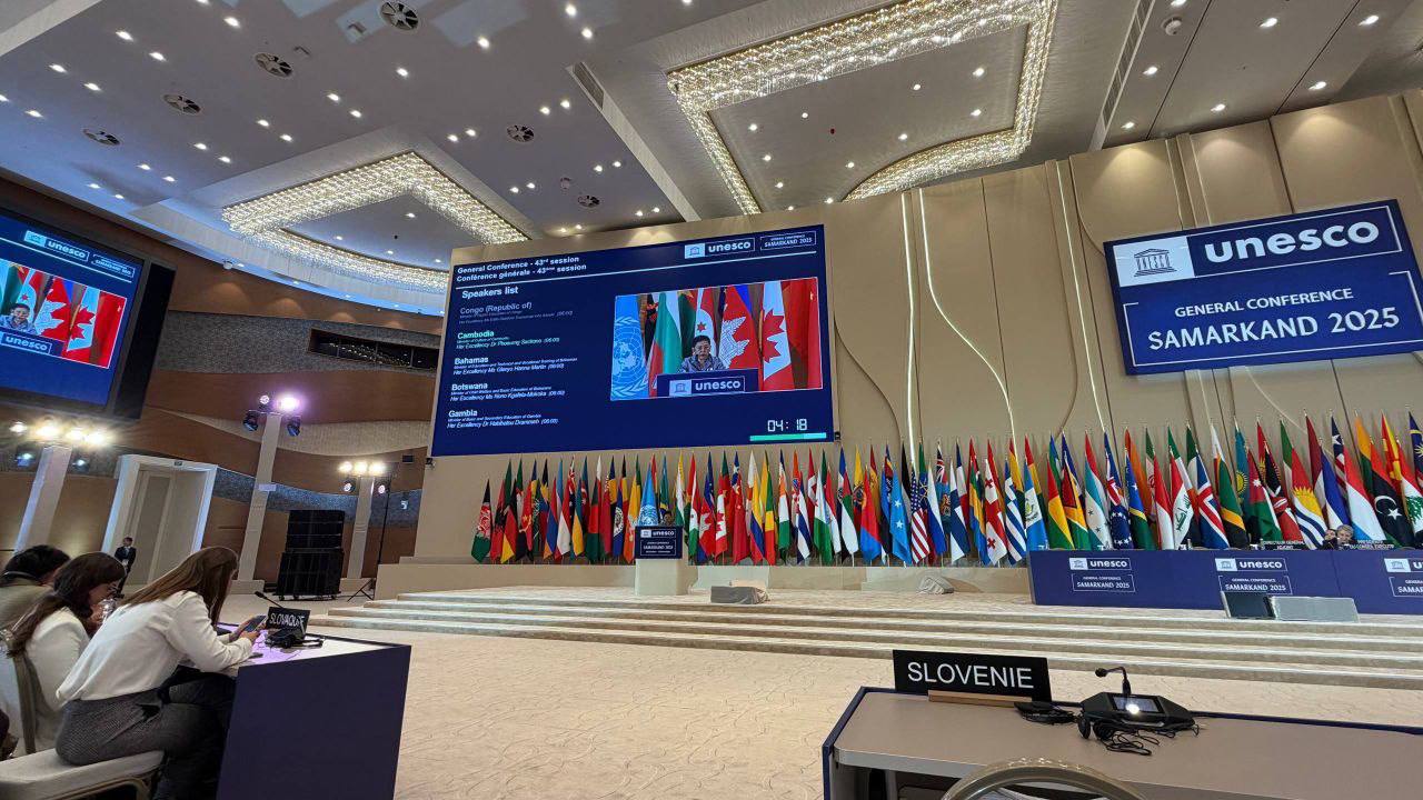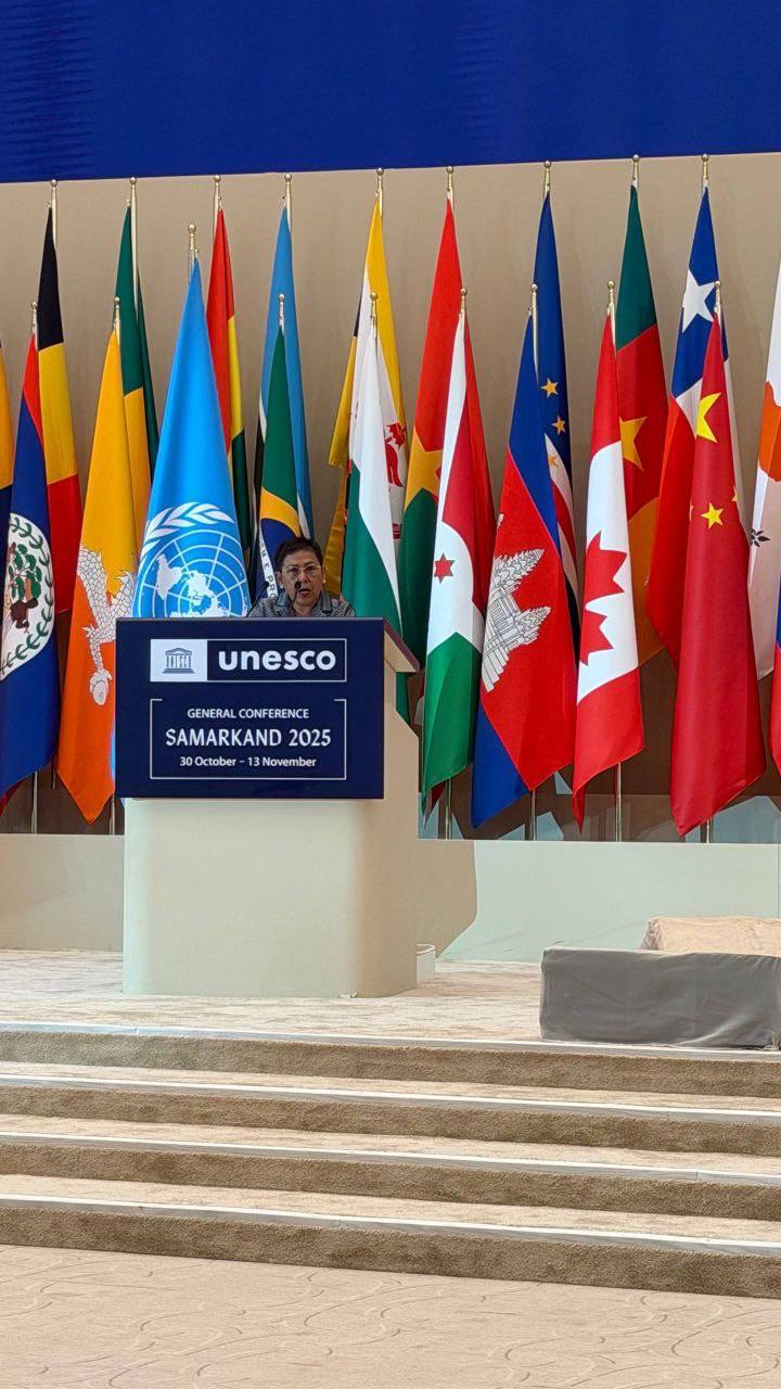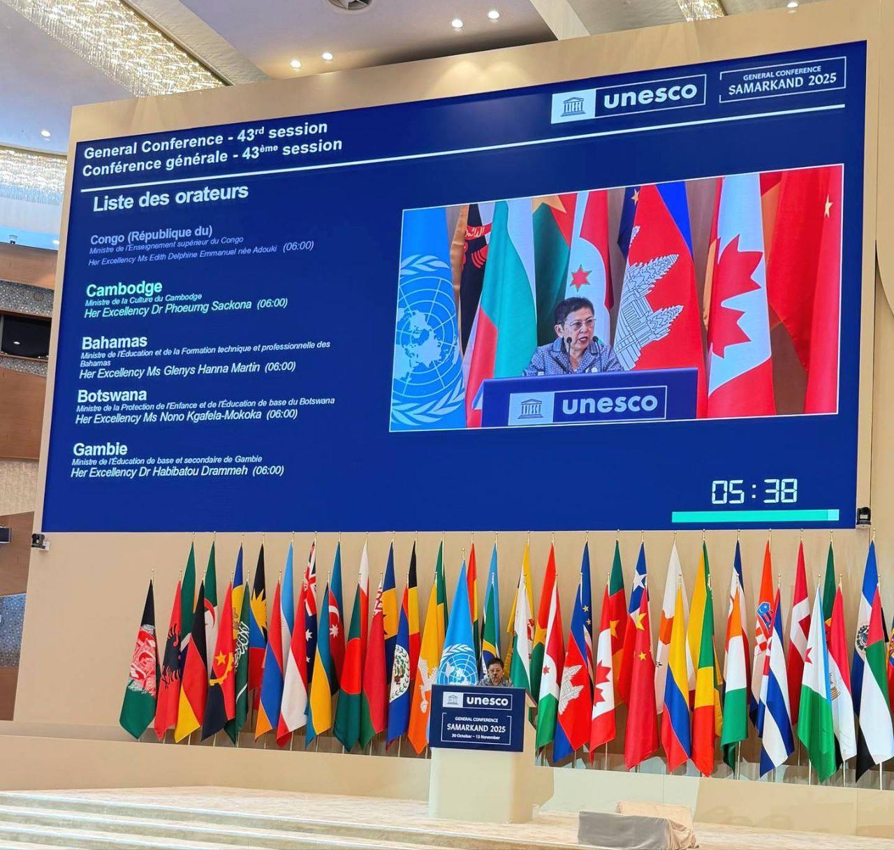 នៅទីក្រុងសាម៉ាកាន់ ប្រទេសអ៊ូសបេគីស្តង់ នារសៀលថ្ងៃទី០៣ ខែវិច្ឆិកា ឆ្នាំ២០២៥ លោកជំទាវបណ្ឌិតសភាចារ្យ ភឿង សកុណា រដ្ឋមន្រ្តីក្រសួងវប្បធម៌ និងវិចិត្រសិល្បៈ អញ្ជើញថ្លែងសន្ទរកថាអំពីគោលនយោបាយរបស់រាជរដ្ឋាភិបាលកម្ពុជាក្នុងអង្គមហាសន្និបាតលើកទី៤៣នៃអង្គការយូណេស្កូ ដោយបានបញ្ជាក់ជាថ្មីនូវការប្តេជ្ញាចិត្តរបស់រាជរដ្ឋាភិបាលកម្ពុជាក្នុងការគាំទ្របេសកកម្មរបស់អង្គការយូណេស្កូក្នុងការស្ថាបនាសន្តិភាពតាមរយៈការអប់រំ វប្បធម៌ វិទ្យាសាស្ត្រ និងទំនាក់ទំនង ស្របតាមយុទ្ធសាស្ត្របញ្ចកោណ ដំណាក់កាលទី១។