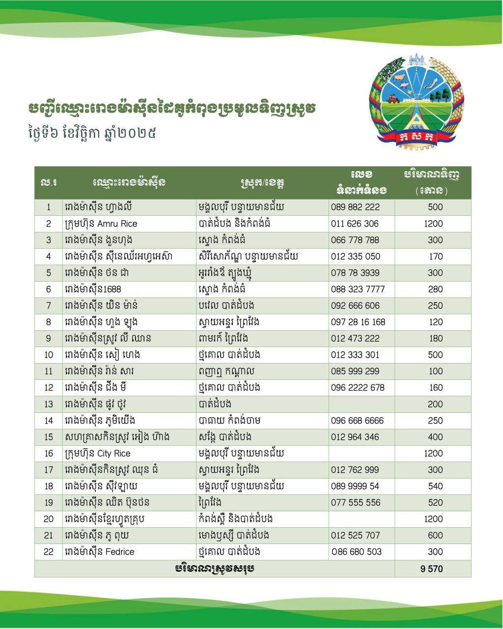 បរិមាណស្រូវសើមជិត១មុឺនតោន ត្រូវបានរោងម៉ាសុីន ដៃគូជាមួយក្រសួងកសិកម្ម សម្រុកប្រមូលទិញពីបងប្អូនកសិករនៅទូទាំងប្រទេសក្នុងថ្ងៃនេះ