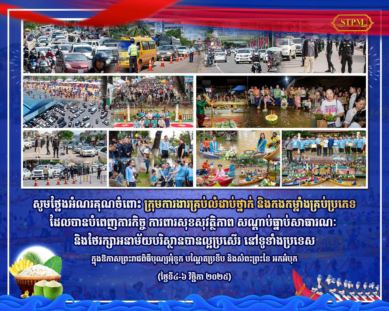 (ភ្នំពេញ)៖ សម្តេចបវរធិបតី ហ៊ុន ម៉ាណែត នាយករដ្ឋមន្ត្រីនៃកម្ពុជា នៅថ្ងៃទី៧ ខែវិច្ឆិកា ឆ្នាំ២០២៥នេះ បានបង្ហោះសារសូមថ្លែងអំណរគុណចំពោះ ក្រុមការងារគ្រប់លំដាប់ថ្នាក់ និងកងកម្លាំងគ្រប់ប្រភេទ ដែលបានបំពេញភារកិច្ច ការពារសុខសុវត្ថិភាព សណ្ដាប់ធ្នាប់សាធារណៈ និងថែរក្សាអនាម័យបរិស្ថានបានល្អប្រសើរ នៅទូទាំងប្រទេស ក្នុងឱកាសព្រះរាជពិធីបុណ្យអុំទូក បណ្ដែតប្រទីប និងសំពះព្រះខែ អកអំបុក ពីថ្ងៃទី៤-៦ វិច្ឆិកា ២០២៥។