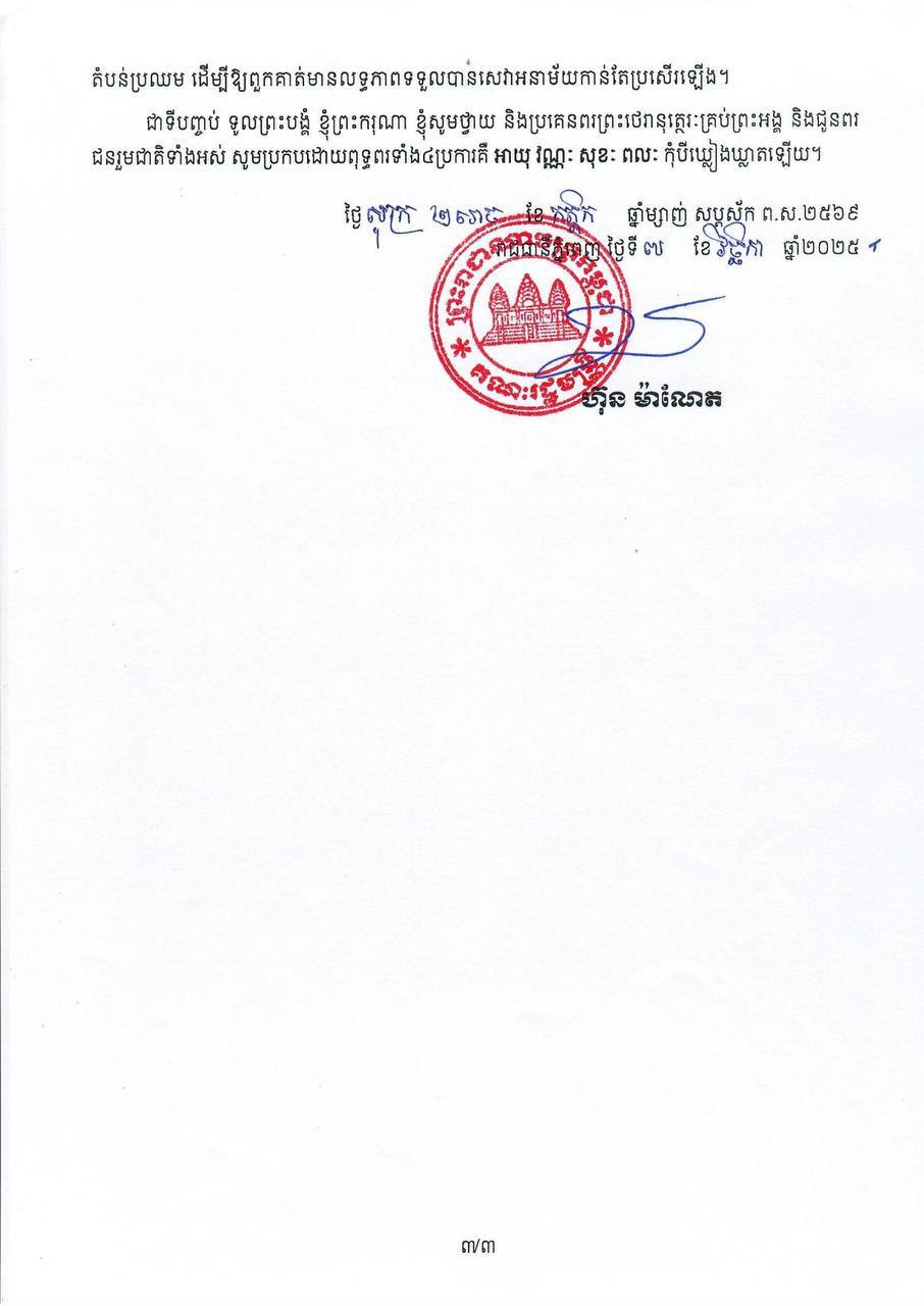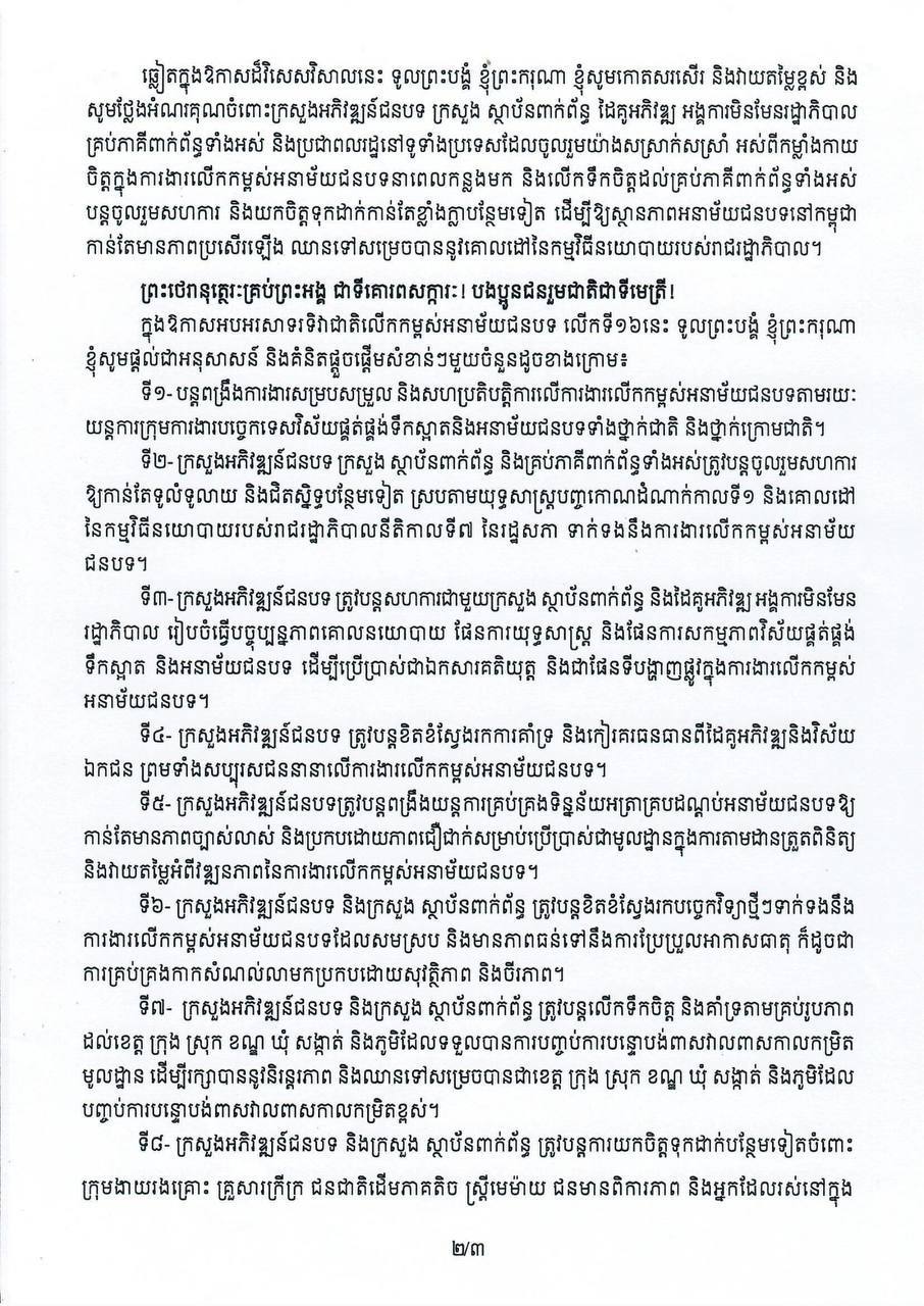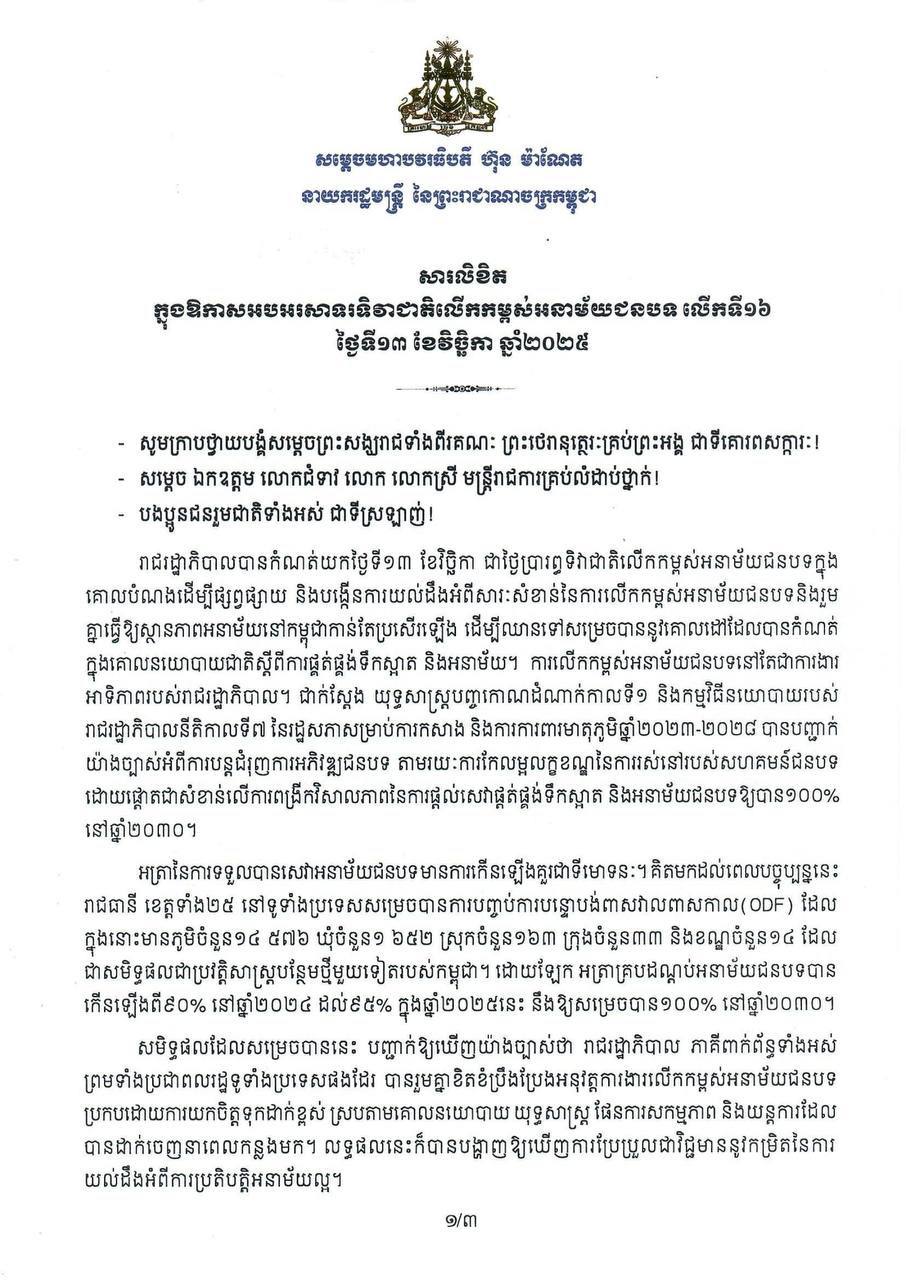 សារលិខិត សម្តេចធិបតី នាយករដ្ឋមន្ត្រី ក្នុងឱកាសអបអរសាទរទិវាជាតិលើកកម្ពស់អនាម័យជនបទ លើកទី១៦ ថ្ងៃទី១៣ ខែវិច្ឆិកា ឆ្នាំ២០២៥ ៕