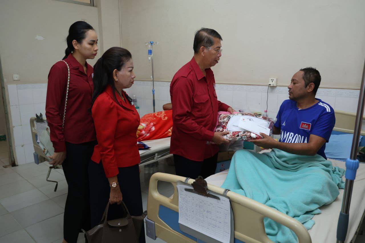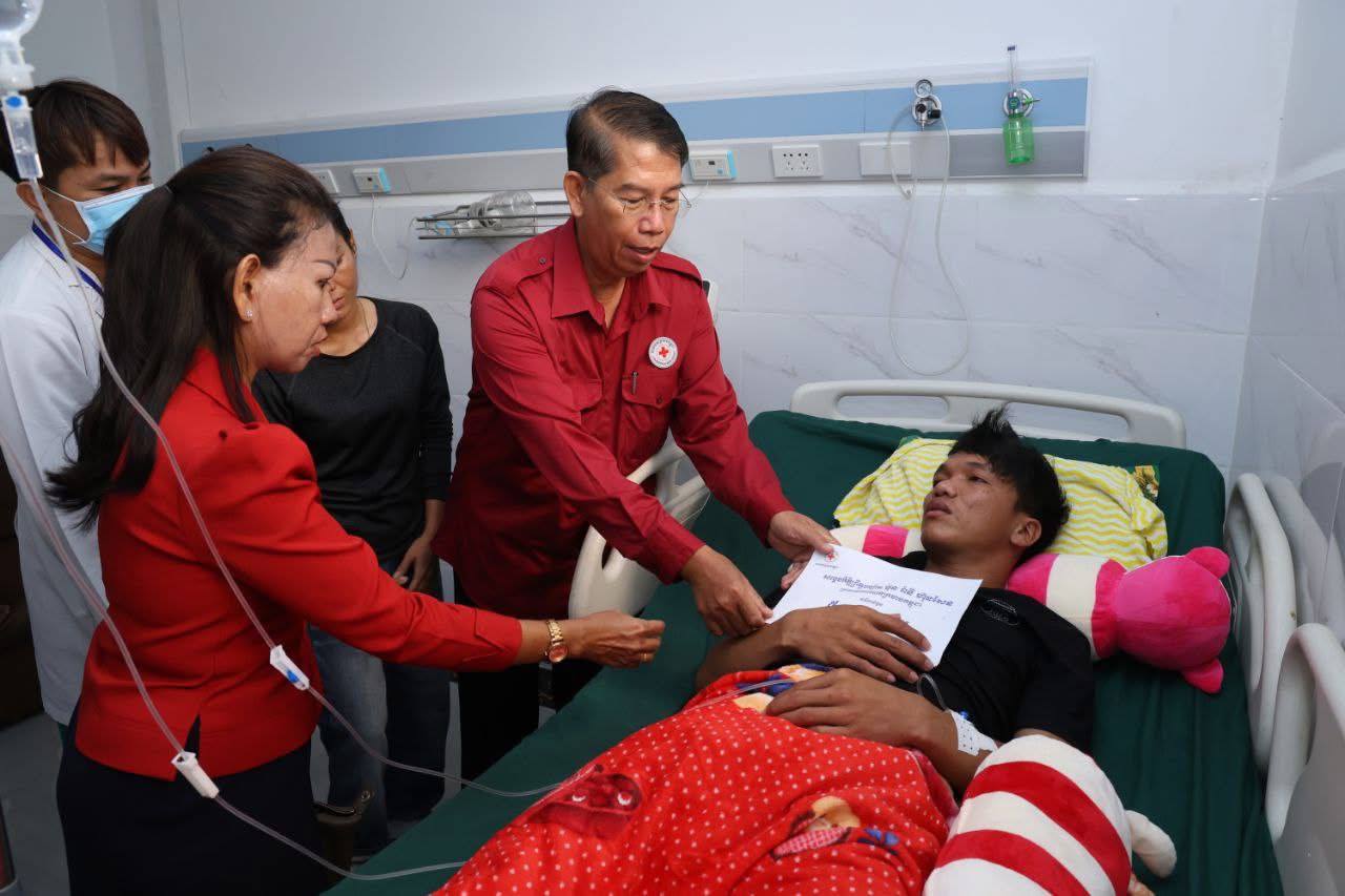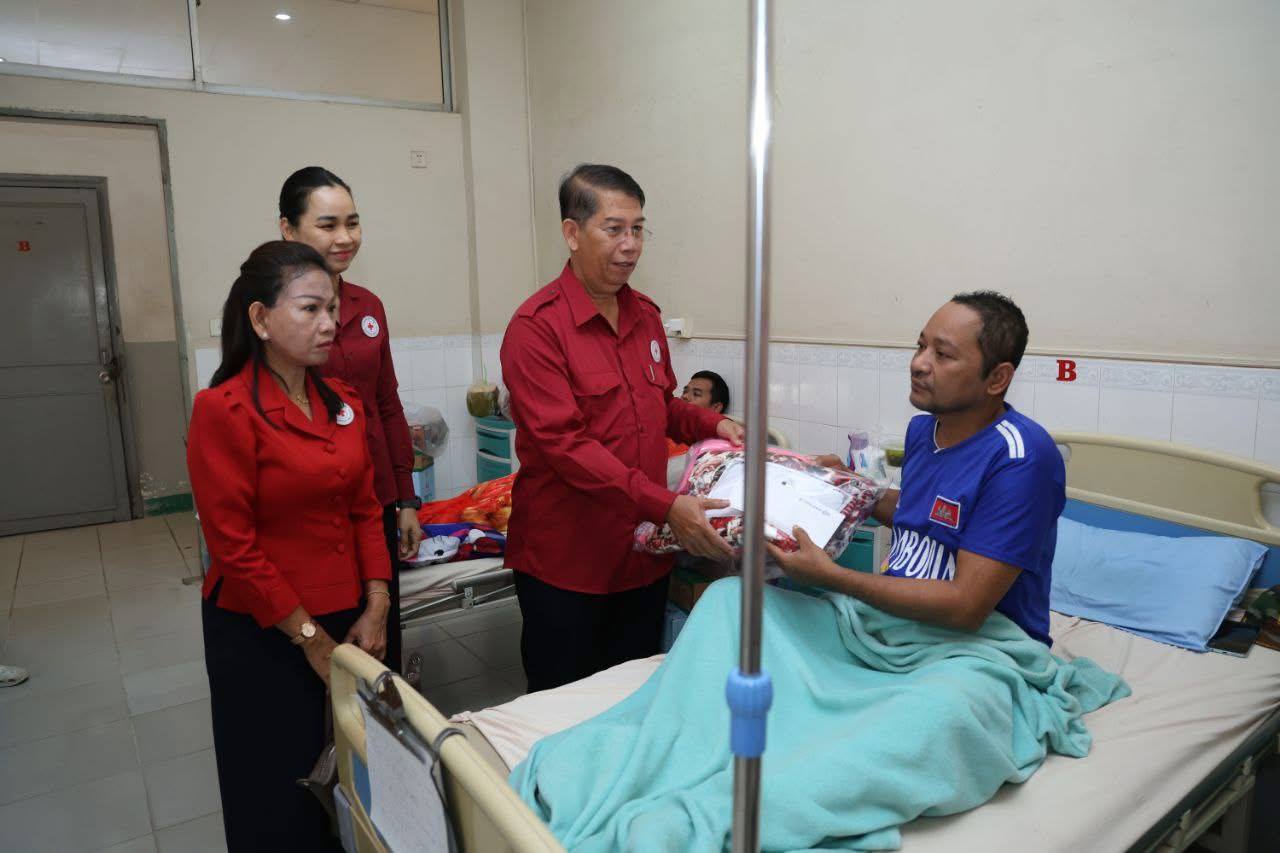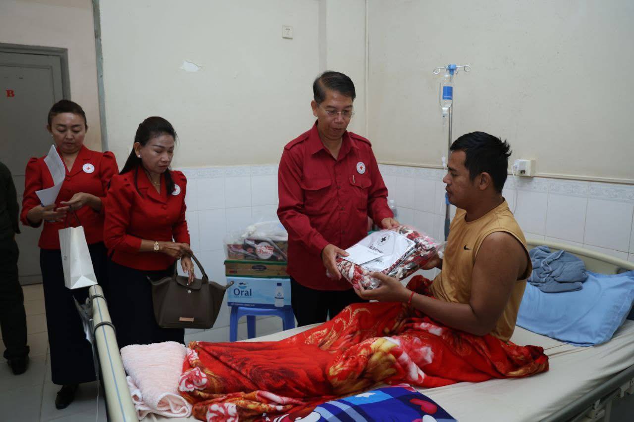 (ភ្នំពេញ)៖ នាព្រឹកថ្ងៃទី៧ ខែវិច្ឆិកា ឆ្នាំ២០២៥នេះ កាកបាទក្រហមកម្ពុជា ក្រោមម្លប់ដ៏ឧត្តុង្គឧត្តមនៃ សម្តេចព្រះមហាក្សត្រី នរោត្តម មុនិនាថ សីហនុ ព្រះវររាជមាតាជាតិខ្មែរ គង់ប្រថាប់ជាព្រះប្រធានកិត្តិយស និងមានសម្តេចកិត្តិព្រឹទ្ធបណ្ឌិត ប៊ុន រ៉ានី ហ៊ុនសែន ជាប្រធាន បានចាត់ឯកឧត្តម យូ ឡាណា អគ្គលេខាធិការរងទី២ កាកបាទក្រហមកម្ពុជា និងសហការី អញ្ជើញនាំសួរសុខទុក្ខ និងនាំយកអំណោយជាថវិកា និងសម្ភារៈមួយចំនួនជូនយោធិន ឃួយ ឡាយ រងគ្រោះដោយសារមីន កាលថ្ងៃទី៣០ ខែតុលា ឆ្នាំ២០២៥ ដែលកំពុងទទួលការព្យាបាល នៅតាមមន្ទីរពេទ្យក្នុងរាជធានីភ្នំពេញ ។ ឆ្លៀតក្នុងឱកាសនេះ ឯកឧត្តមអគ្គលេខាធិការរងទី២ និងសហការី បានសួរសុខទុក្ខ យោធិនជួរមុខមួយចំនួនកំពុងសម្រាកព្យាបាលក្នុងមន្ទីរពេទ្យ។