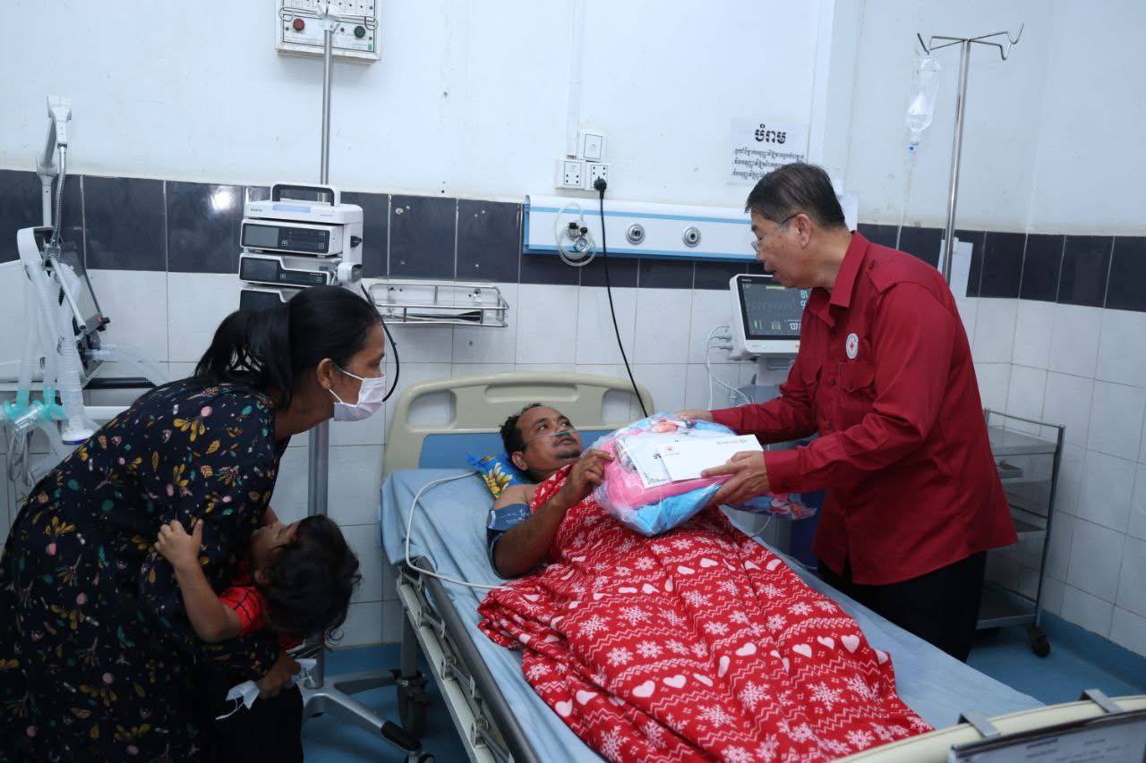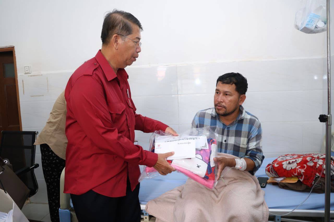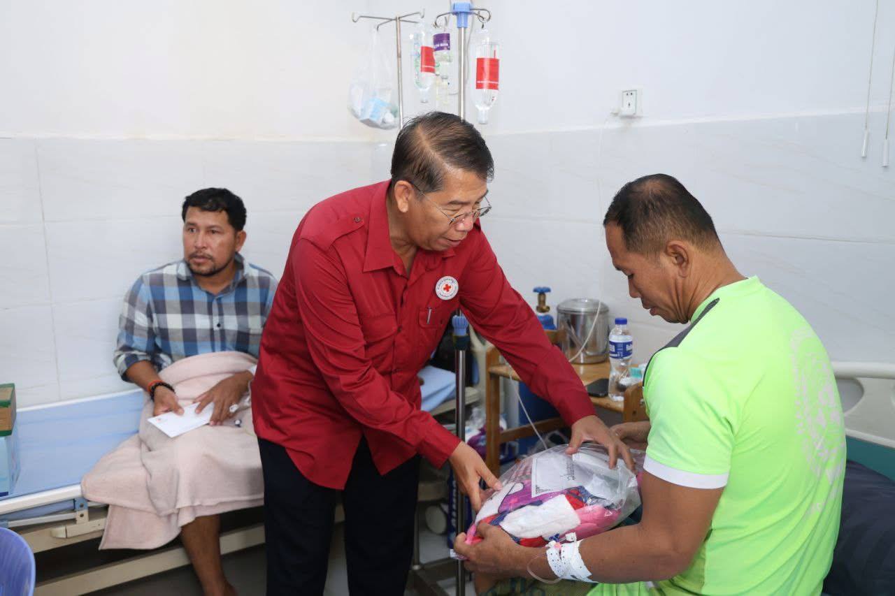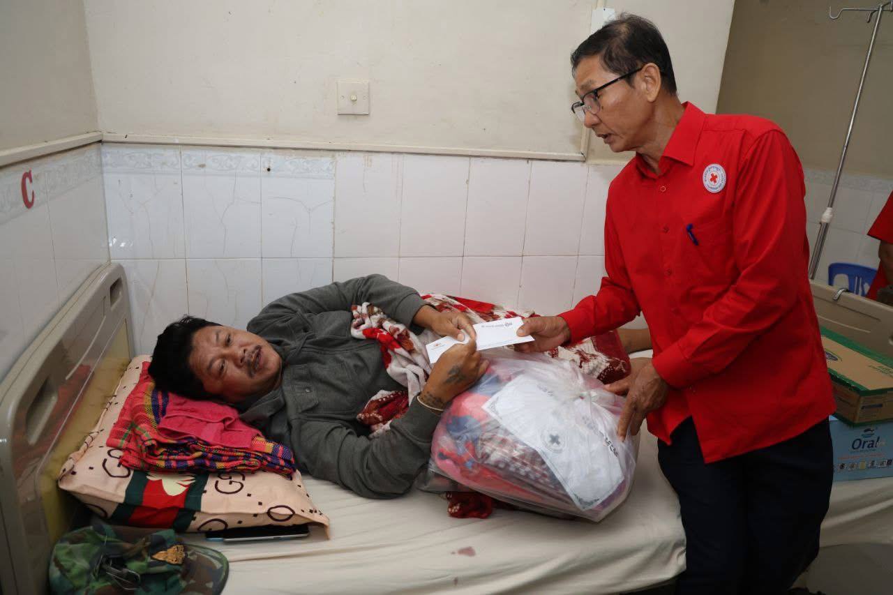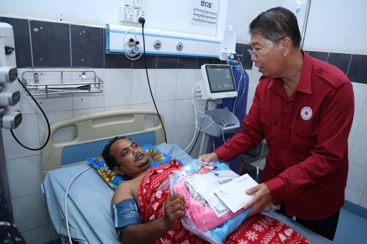 (ភ្នំពេញ)៖ នាព្រឹកថ្ងៃទី៧ ខែវិច្ឆិកា ឆ្នាំ២០២៥នេះ កាកបាទក្រហមកម្ពុជា ក្រោមម្លប់ដ៏ឧត្តុង្គឧត្តមនៃ សម្តេចព្រះមហាក្សត្រី នរោត្តម មុនិនាថ សីហនុ ព្រះវររាជមាតាជាតិខ្មែរ គង់ប្រថាប់ជាព្រះប្រធានកិត្តិយស និងមានសម្តេចកិត្តិព្រឹទ្ធបណ្ឌិត ប៊ុន រ៉ានី ហ៊ុនសែន ជាប្រធាន បានចាត់ឯកឧត្តម យូ ឡាណា អគ្គលេខាធិការរងទី២ កាកបាទក្រហមកម្ពុជា និងសហការី អញ្ជើញនាំសួរសុខទុក្ខ និងនាំយកអំណោយជាថវិកា និងសម្ភារៈមួយចំនួនជូនយោធិន ឃួយ ឡាយ រងគ្រោះដោយសារមីន កាលថ្ងៃទី៣០ ខែតុលា ឆ្នាំ២០២៥ ដែលកំពុងទទួលការព្យាបាល នៅតាមមន្ទីរពេទ្យក្នុងរាជធានីភ្នំពេញ ។ ឆ្លៀតក្នុងឱកាសនេះ ឯកឧត្តមអគ្គលេខាធិការរងទី២ និងសហការី បានសួរសុខទុក្ខ យោធិនជួរមុខមួយចំនួនកំពុងសម្រាកព្យាបាលក្នុងមន្ទីរពេទ្យ។