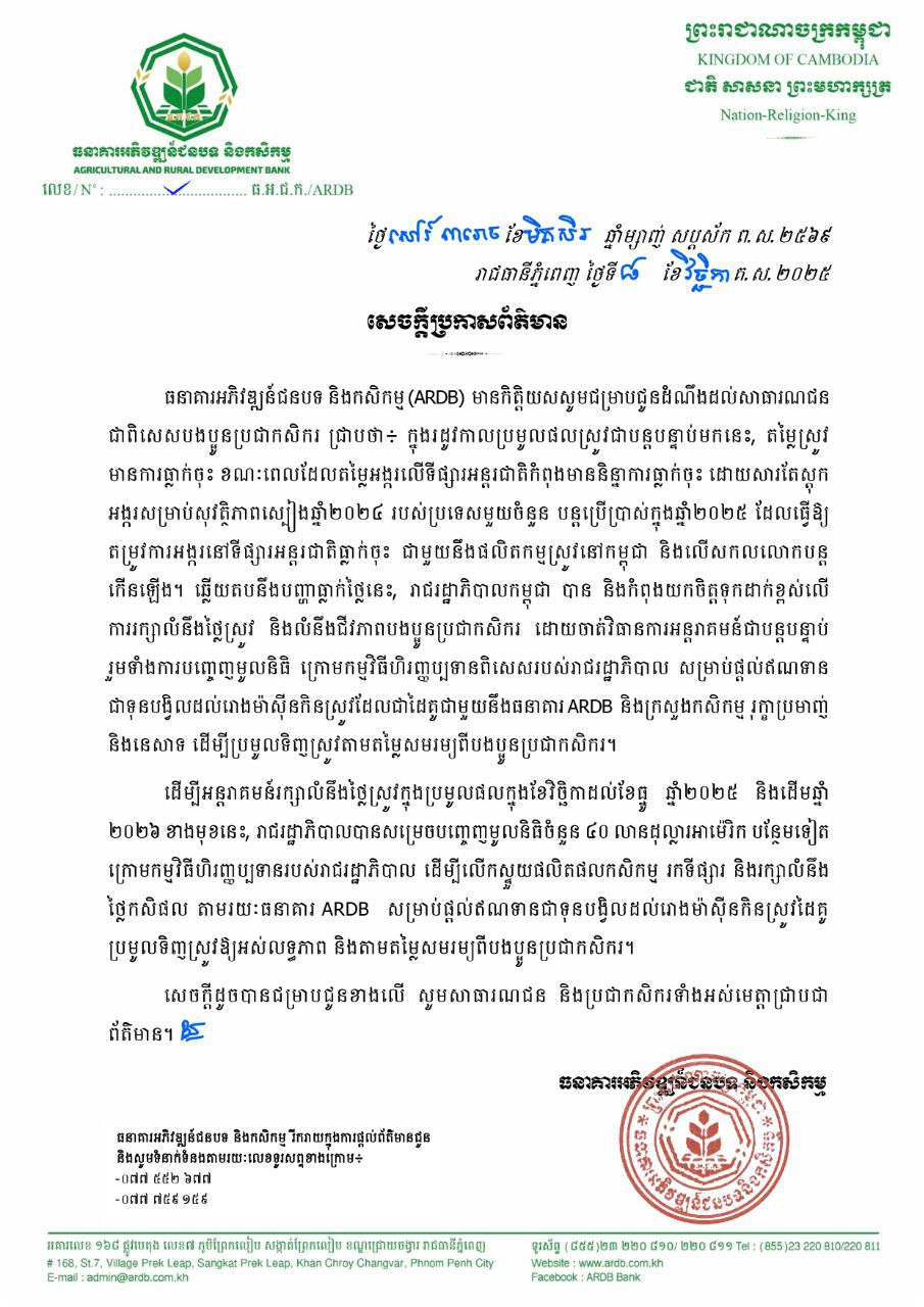 ដើម្បីអន្តរាគមន៍រក្សាលំនឹងថ្លៃស្រូវក្នុងប្រមូលផលក្នុងខែវិច្ឆិកាដល់ខែធ្នូ ឆ្នាំ២០២៥ និងដើមឆ្នាំ ២០២៦ ខាងមុខនេះ រាជរដ្ឋាភិបាលបានសម្រេចបញ្ចេញមូលនិធិចំនួន៤០ លានដុល្លារអាម៉េរិកបន្ថែមទៀត ក្រោមកម្មវិធីហិរញ្ញប្បទានរបស់រាជរដ្ឋាភិបាល ដើម្បីលើកស្ទួយផលិតផលកសិកម្ម រកទីផ្សារ និងរក្សាលំនឹង ថ្លៃកសិផល តាមរយៈធនាគារ ARDB សម្រាប់ផ្តល់ឥណទានជាបង្វិលដល់រោងម៉ាស៊ីនកិនស្រូវដៃគូ ប្រមូលទិញស្រូវឱ្យអស់លទ្ធភាព និងតាមតម្លៃសមរម្យពីបងប្អូនប្រជាកសិករ៕