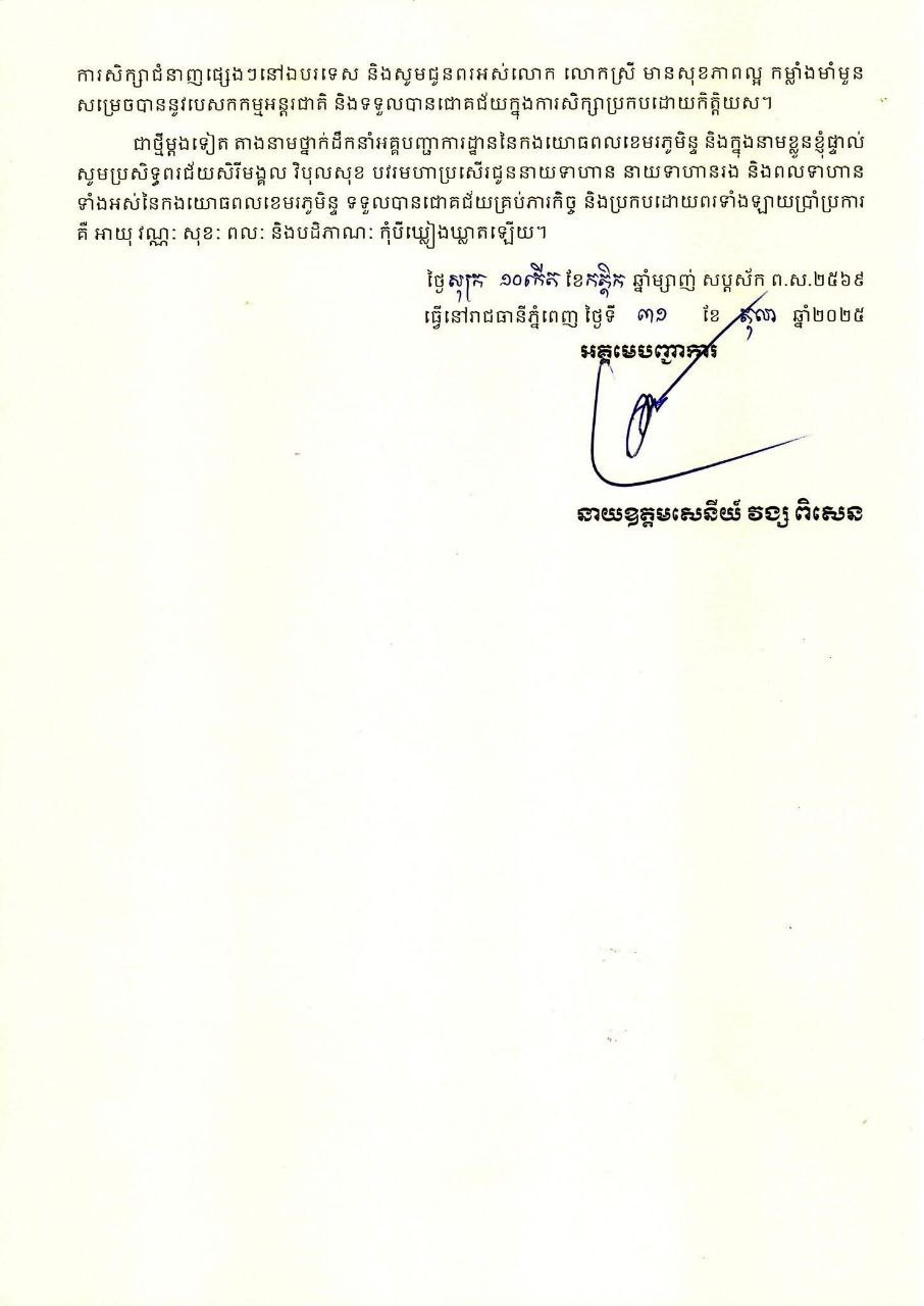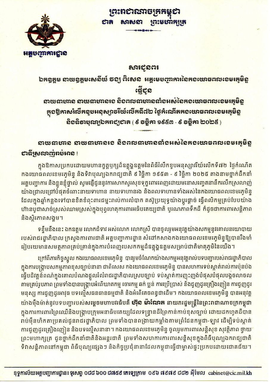 ឯកឧត្ដម នាយឧត្ដមសេនីយ៍ វង្ស ពិសេន អគ្គមេបញ្ជាការនៃកងយោធពលខេមរភូមិន្ទ ផ្ញើសារជូនពរ នាយទាហាន នាយទាហានរង និងពលទាហានទាំងអស់នៃកងយោធពលខេមរភូមិន្ទ ក្នុងឱកាសខួបអនុស្សាវរីយ៍លើកទី៧២ ទិវាកំណើតកងយោធពលខេមរភូមិន្ទ និងទិវាបុណ្យឯករាជ្យជាតិ ថ្ងៃទី០៩ ខែវិច្ឆិកា ឆ្នាំ១៩៥៣-ថ្ងៃទី០៩ ខែវិច្ឆិកា ឆ្នាំ២០២៥។