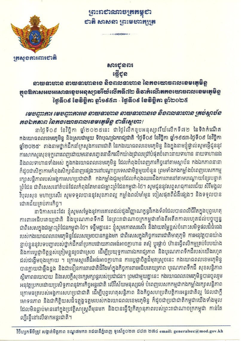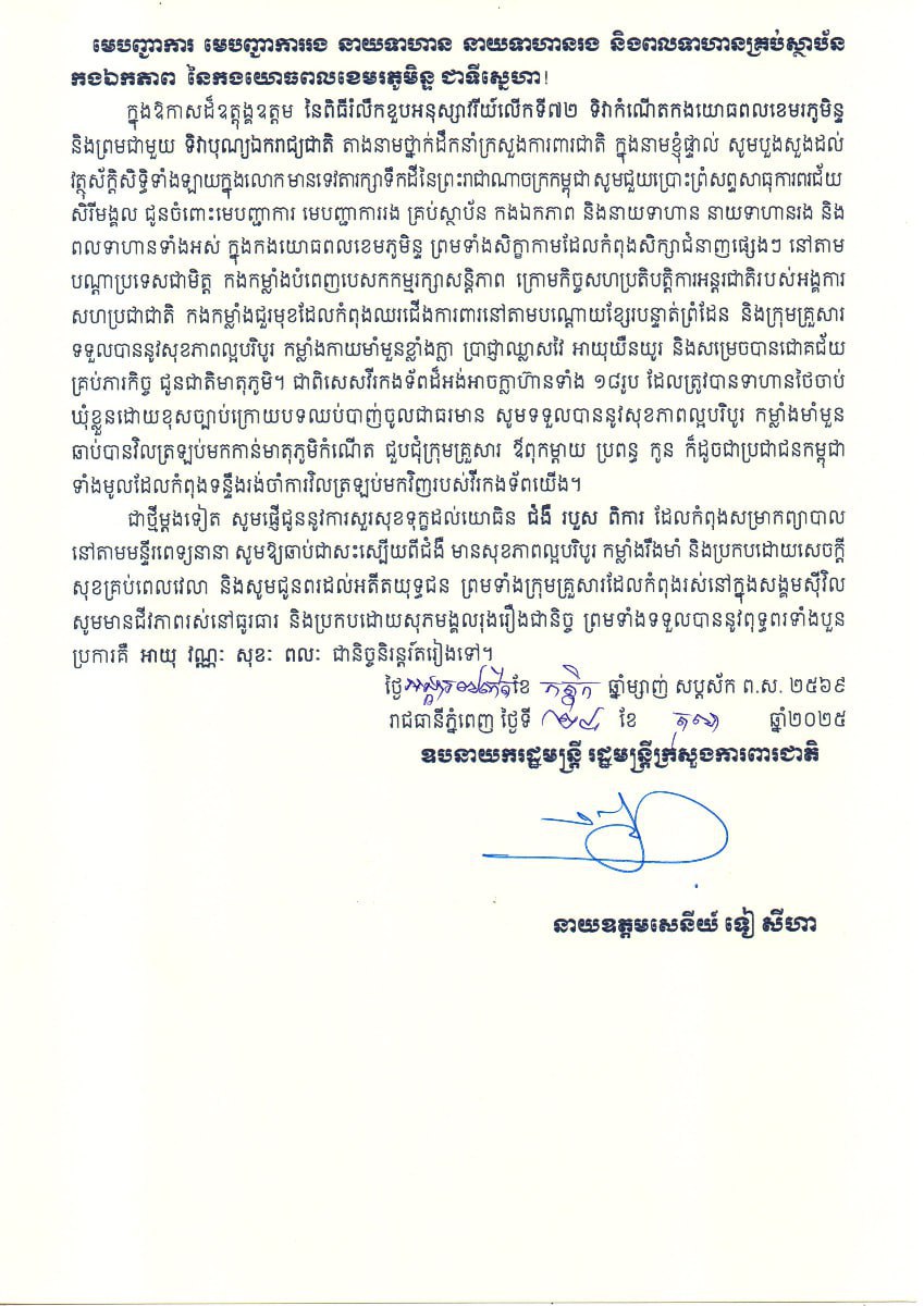 ក្នុងឱកាសដ៏ឧត្ដុង្គឧត្តម នៃពិធីរំលឹកខួបអនុស្សាវរីយ៍លើកទី៧២ ទិវាកំណើតកងយោធពលខេមរភូមិន្ទ និងព្រមជាមួយទិវាបុណ្យឯករាជ្យជាតិនេះដែរ នាយឧត្តមសេនីយ៍ទៀ សីហា ក៏បានផ្ញើជូននូវការសាកសួរសុខទុក្ខពោរពេញដោយមនោសញ្ចេតនានឹករលឹកយ៉ាងជ្រាលជ្រៅបំផុតចំពោះនាយទាហាន នាយទាហានរង និងពលទាហានទាំងអស់ ក្នុងកងយោធពលខេមរភូមិន្ទ ដែលកំពុងបំពេញភារកិច្ចនៅតាមស្ថាប័ន កងឯកភាពនានា ក៏ដូចជាសិក្ខាកាមកំពុងសិក្សាជំនាញផ្សេងៗនៅបណ្តាប្រទេសជាមិត្តមួយចំនួន ព្រមទាំងកងកម្លាំងបំពេញបេសកកម្មរក្សាសន្តិភាពរបស់អង្គការសហប្រជាជាតិ កងកម្លាំងជួរមុខដែលកំពុងឈរជើងការពារនៅតាមបណ្ដោយខ្សែរបន្ទាត់ ព្រំដែន ជាពិសេសនៅតំបន់ដែលកំពុងតែមានជម្លោះព្រំដែនកម្ពុជា-ថៃ៕