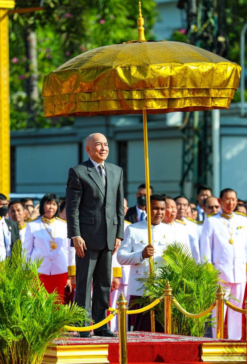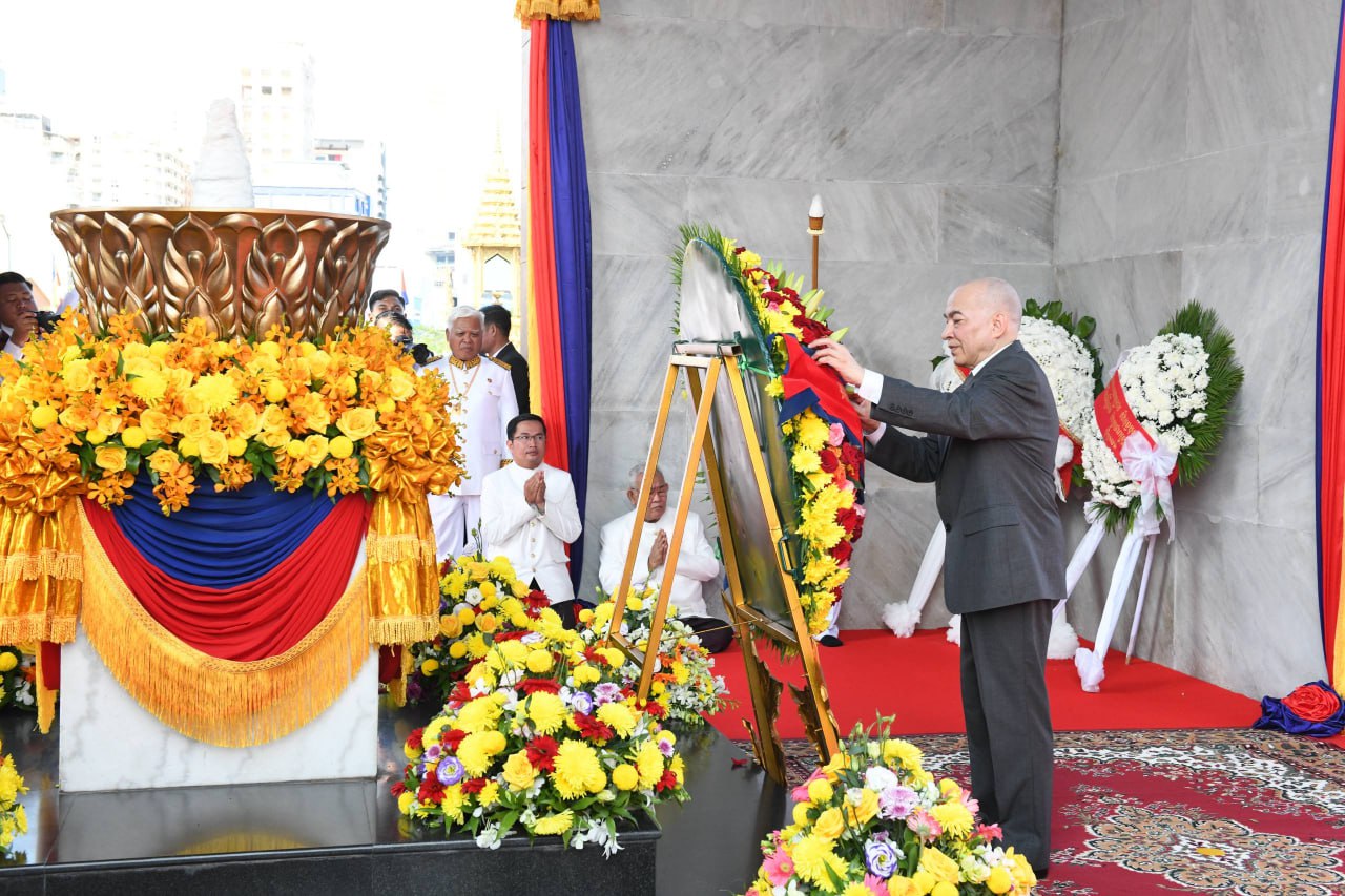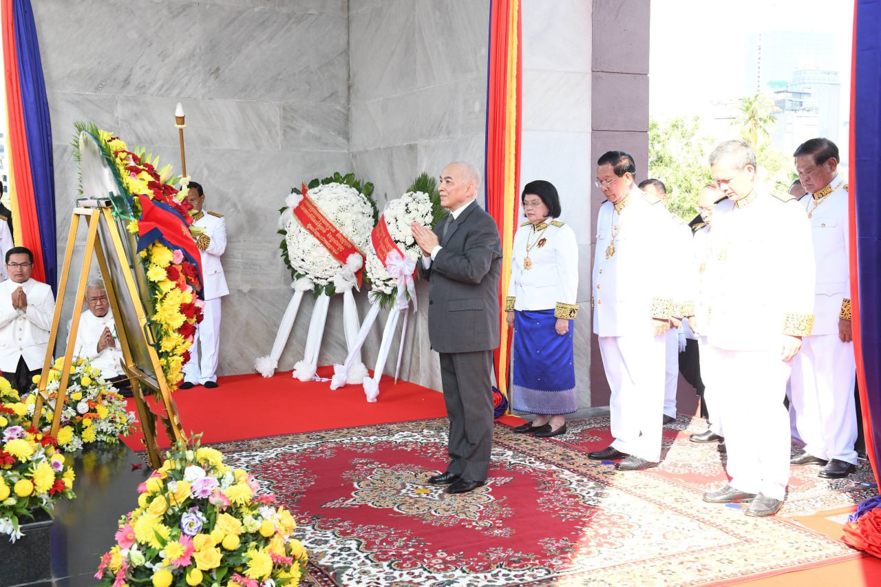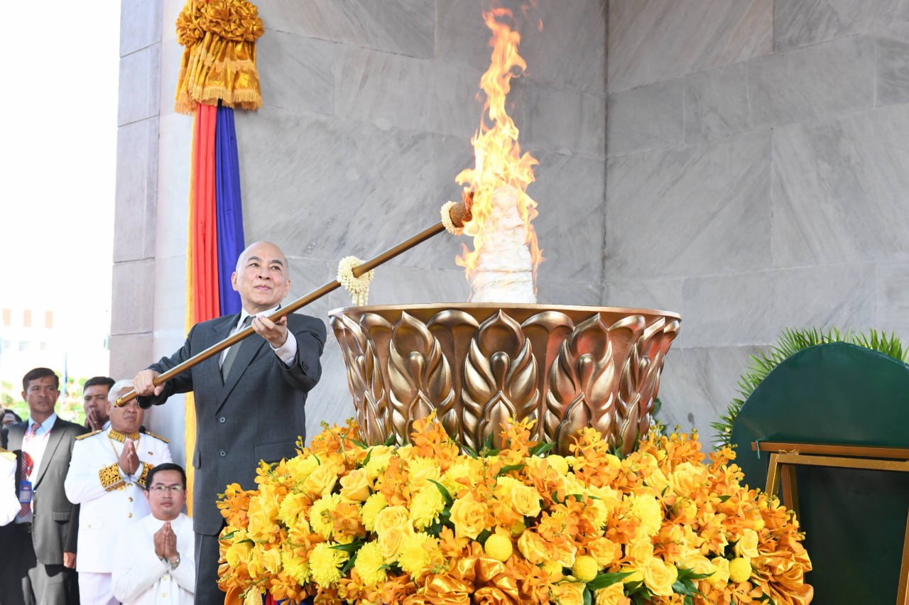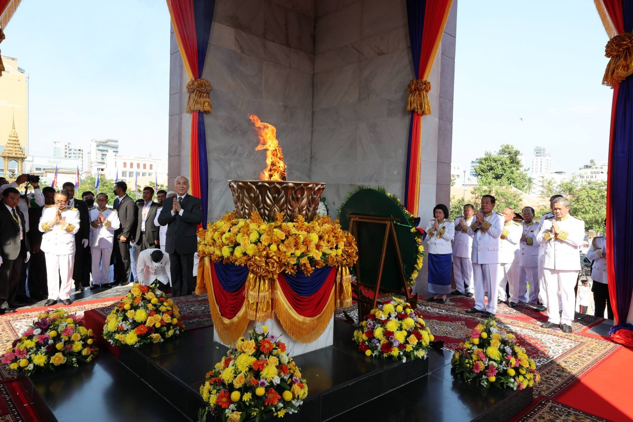 ព្រះករុណា ព្រះបាទសម្តេចព្រះបរមនាថ នរោត្តម សីហមុនី ព្រះមហាក្សត្រ នៃព្រះរាជាណាចក្រកម្ពុជា ស្តេចយាងជាព្រះរាជាធិបតីដ៏ខ្ពង់ខ្ពស់បំផុត និងប្រទានភ្លើងជ័យ ក្នុងឱកាសខួបអនុស្សាវរីយ៍លើកទី៧២ នៃទិវាបុណ្យឯករាជ្យជាតិ ៩ វិច្ឆិកា (៩ វិច្ឆិកា ១៩៥៣ – ៩ វិច្ឆិកា ២០២៥) និងទិវាកំណើតនៃកងយោធពលខេមរភូមិន្ទ នាព្រឹកថ្ងៃទី០៩ ខែវិច្ឆិកា ឆ្នាំ២០២៥ នៅរាជធានីភ្នំពេញ ដោយមានការអញ្ជើញចូលរួមពីសំណាក់ថ្នាក់ដឹកនាំព្រឹទ្ធសភា រដ្ឋសភា រាជរដ្ឋាភិបាល អង្គទូតប្រទេសប្រចាំនៅកម្ពុជា និងមន្រ្តីរាជការច្រើនរូប។