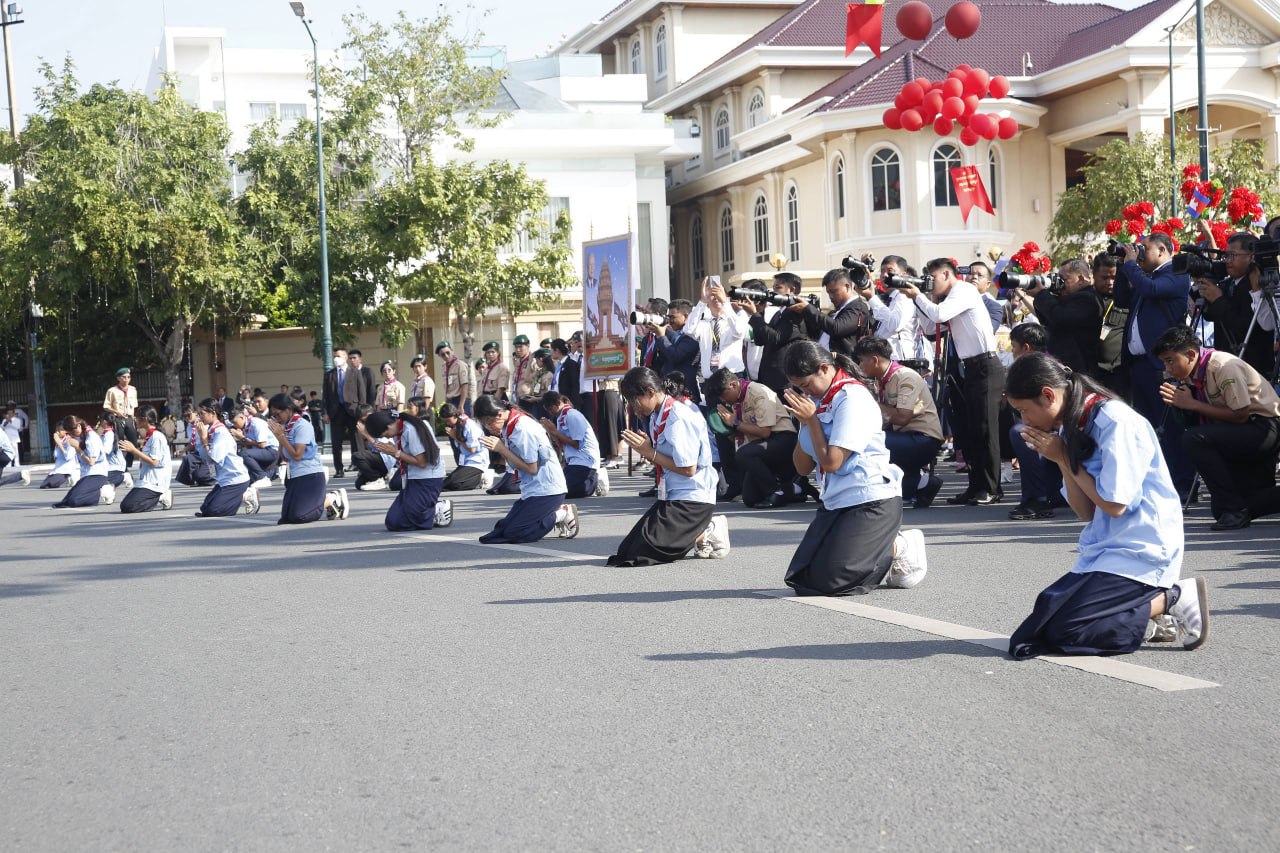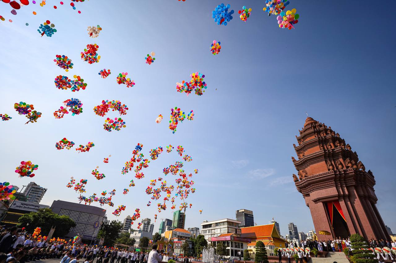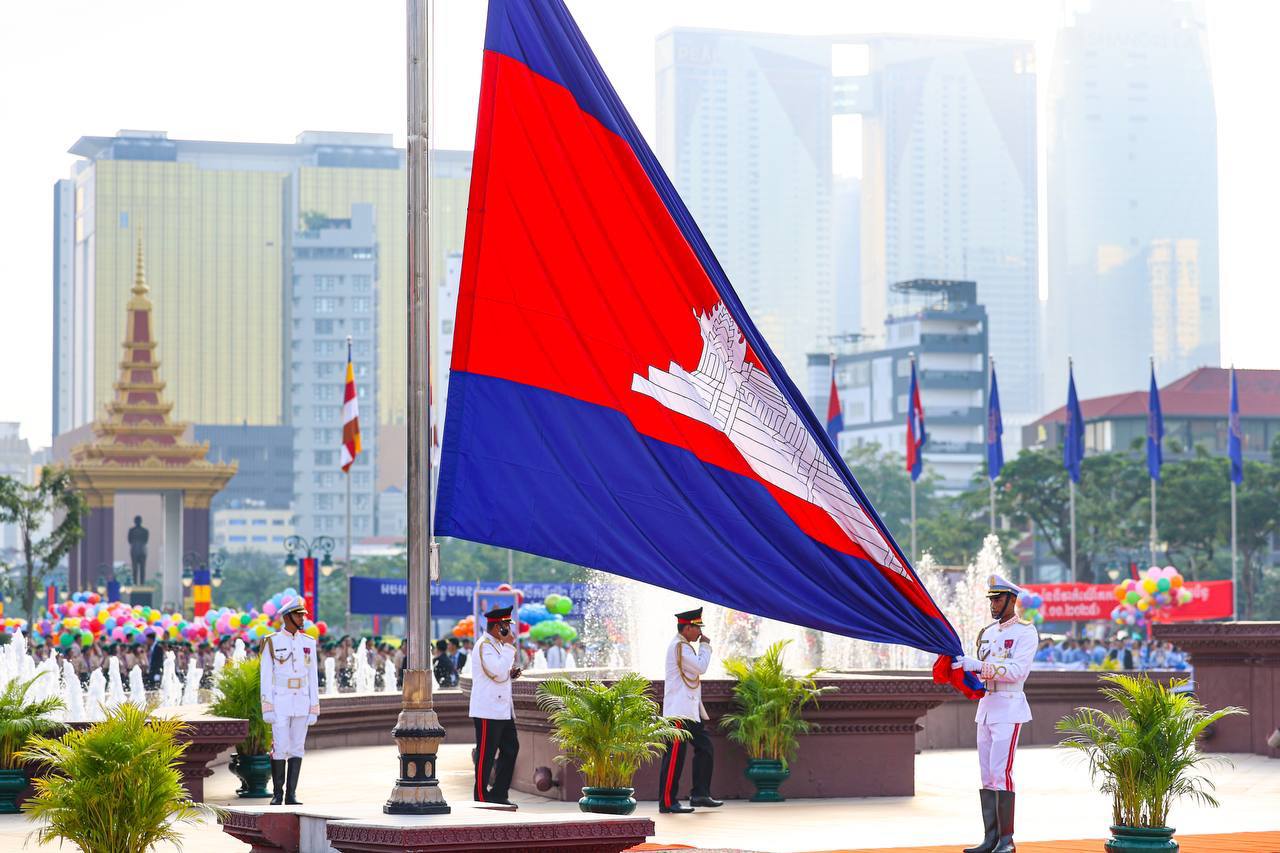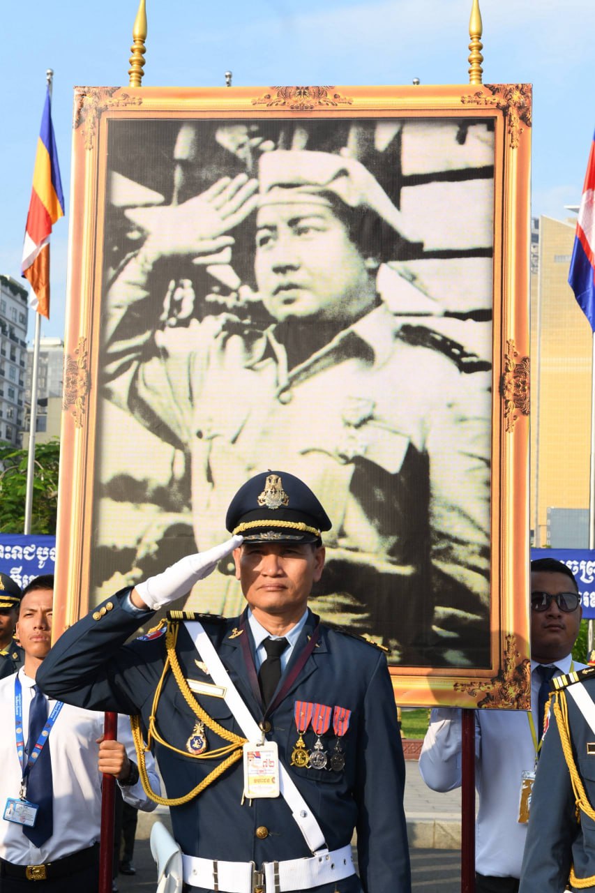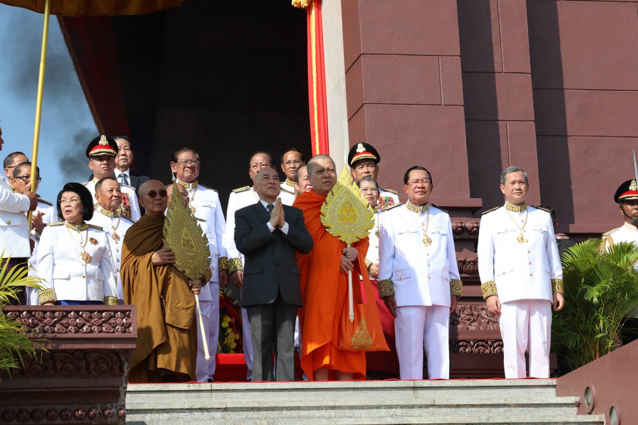 ព្រះករុណា ព្រះបាទសម្តេចព្រះបរមនាថ នរោត្តម សីហមុនី ព្រះមហាក្សត្រ នៃព្រះរាជាណាចក្រកម្ពុជា ស្តេចយាងជាព្រះរាជាធិបតីដ៏ខ្ពង់ខ្ពស់បំផុត និងប្រទានភ្លើងជ័យ ក្នុងឱកាសខួបអនុស្សាវរីយ៍លើកទី៧២ នៃទិវាបុណ្យឯករាជ្យជាតិ ៩ វិច្ឆិកា (៩ វិច្ឆិកា ១៩៥៣ – ៩ វិច្ឆិកា ២០២៥) និងទិវាកំណើតនៃកងយោធពលខេមរភូមិន្ទ នាព្រឹកថ្ងៃទី០៩ ខែវិច្ឆិកា ឆ្នាំ២០២៥ នៅរាជធានីភ្នំពេញ ដោយមានការអញ្ជើញចូលរួមពីសំណាក់ថ្នាក់ដឹកនាំព្រឹទ្ធសភា រដ្ឋសភា រាជរដ្ឋាភិបាល អង្គទូតប្រទេសប្រចាំនៅកម្ពុជា និងមន្រ្តីរាជការច្រើនរូប។