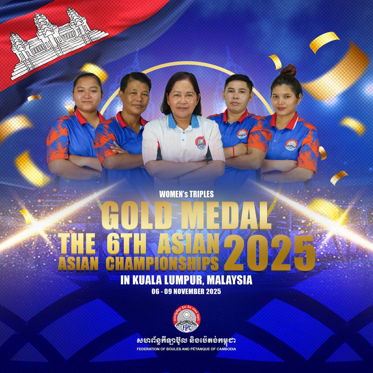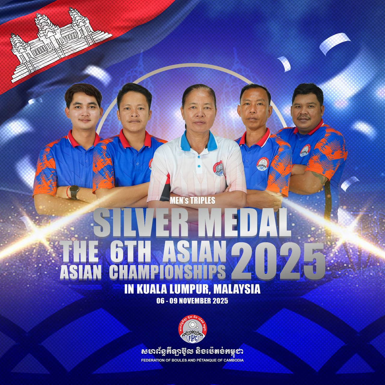 (ភ្នំពេញ)៖ កម្ពុជាដណ្ដើមបានមេដាយ ២គ្រឿងទៀតហើយ រួមមានមេដាយមាស ១ និងប្រាក់ ១ នៅព្រឹកថ្ងៃទី៩ ខែវិច្ឆិកានេះ ក្នុងការប្រកួតកីឡាប៉េតង់ជ្រើសរើសជើងឯកអាស៊ី លើកទី៦(The 6th Petanque Championship) ឆ្នាំ២០២៥ នៅទីក្រុងគូឡាឡាំពួរ ប្រទេសម៉ាឡេស៊ី។