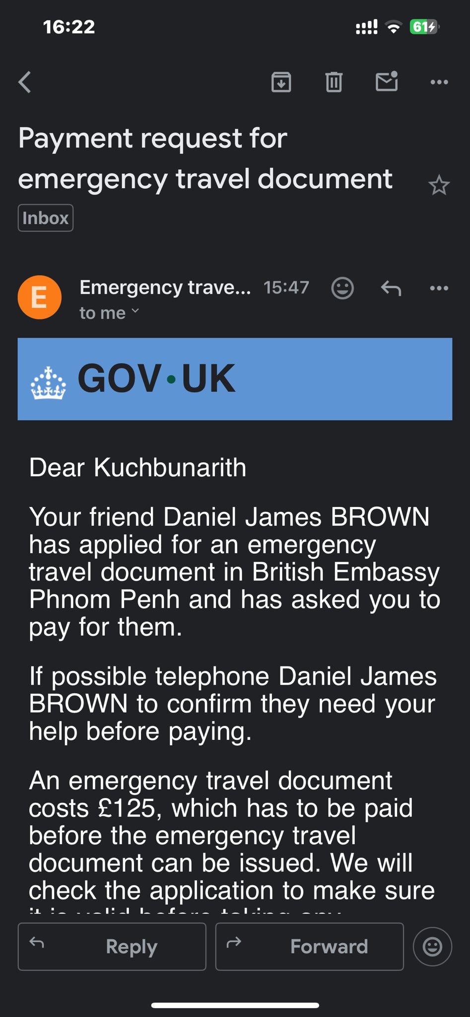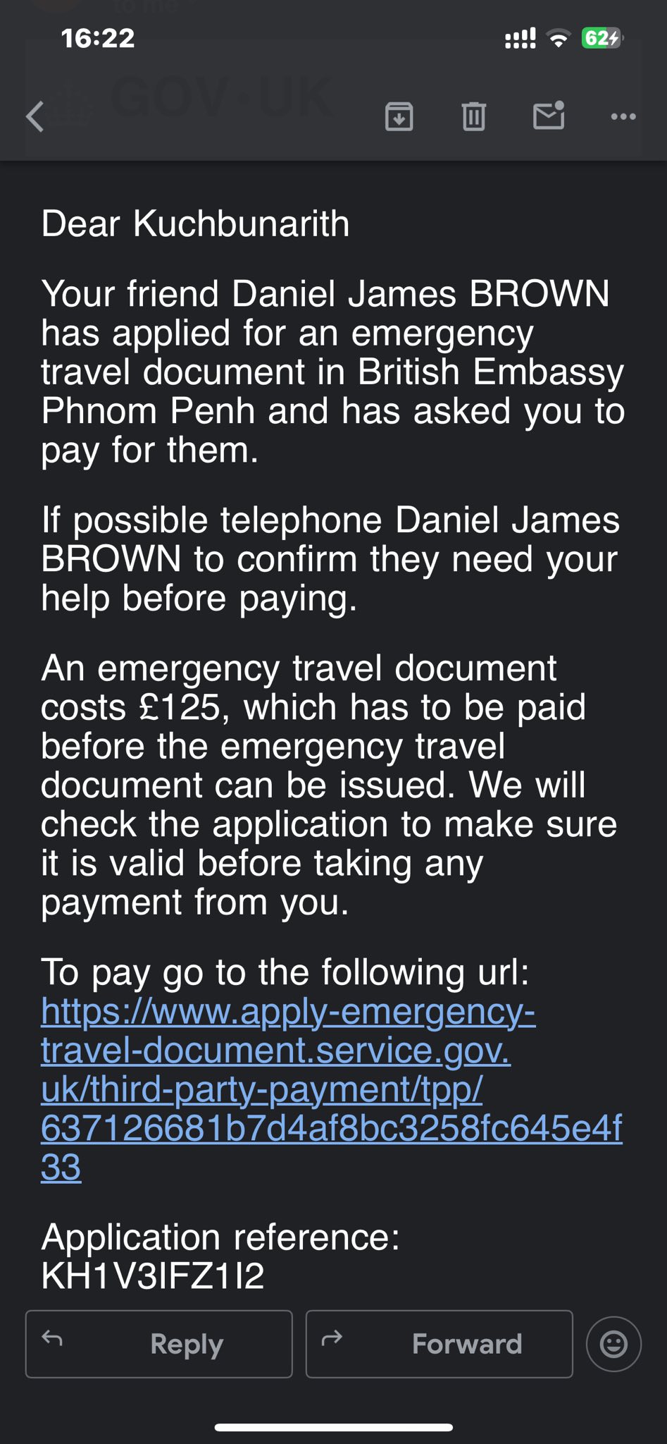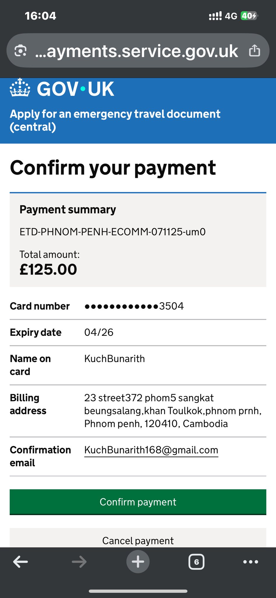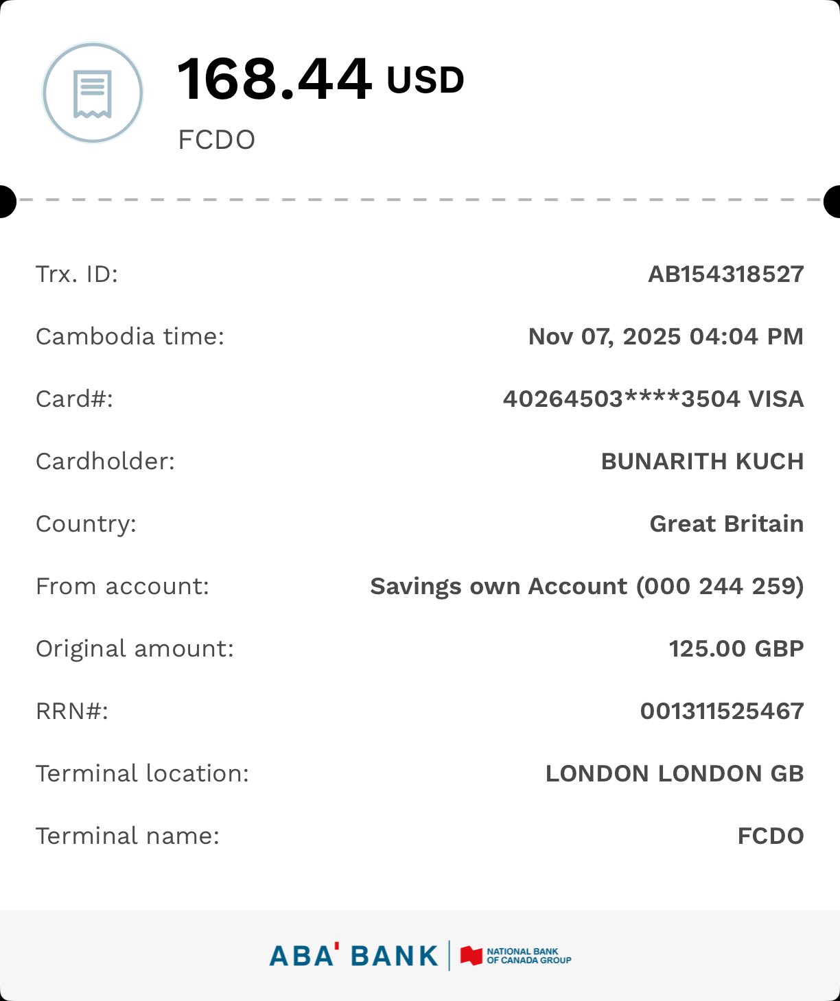 ព្រមទាំងបានបង់ថវិកាថ្លៃ Emergency Travel documents អស់ទឹកប្រាក់ 168,44$។