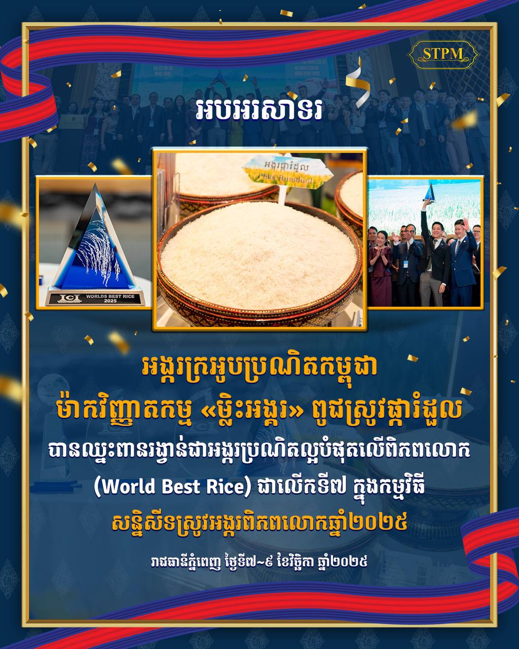 សម្តេចមហាបវរធិបតី ហ៊ុន ម៉ាណែត នាយករដ្ឋមន្ត្រីនៃព្រះរាជាណាចក្រកម្ពុជា អបអរសាទរ អង្ករក្រអូបប្រណិតកម្ពុជា ម៉ាកវិញ្ញាតកម្ម «ម្លិះអង្គរ» ពូជស្រូវផ្ការំដួល បានឈ្នះពានរង្វាន់ជាអង្ករប្រណិតល្អបំផុតលើពិភពលោក (World Best Rice) ជាលើកទី៧ ក្នុងកម្មវិធី សន្និសីទស្រូវអង្ករពិភពលោកឆ្នាំ២០២៥