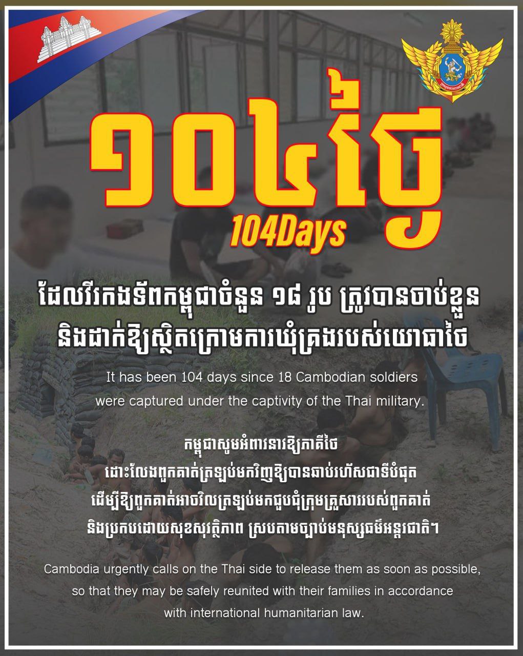 ថ្ងៃនេះជា ថ្ងៃទី១០៤ហើយ ដែលវីរកងទ័ពកម្ពុជាចំនួន ១៨រូប ត្រូវបានចាប់ខ្លួន និងដាក់ឱ្យស្ថិតក្រោមការឃុំគ្រងរបស់យោធាថៃ