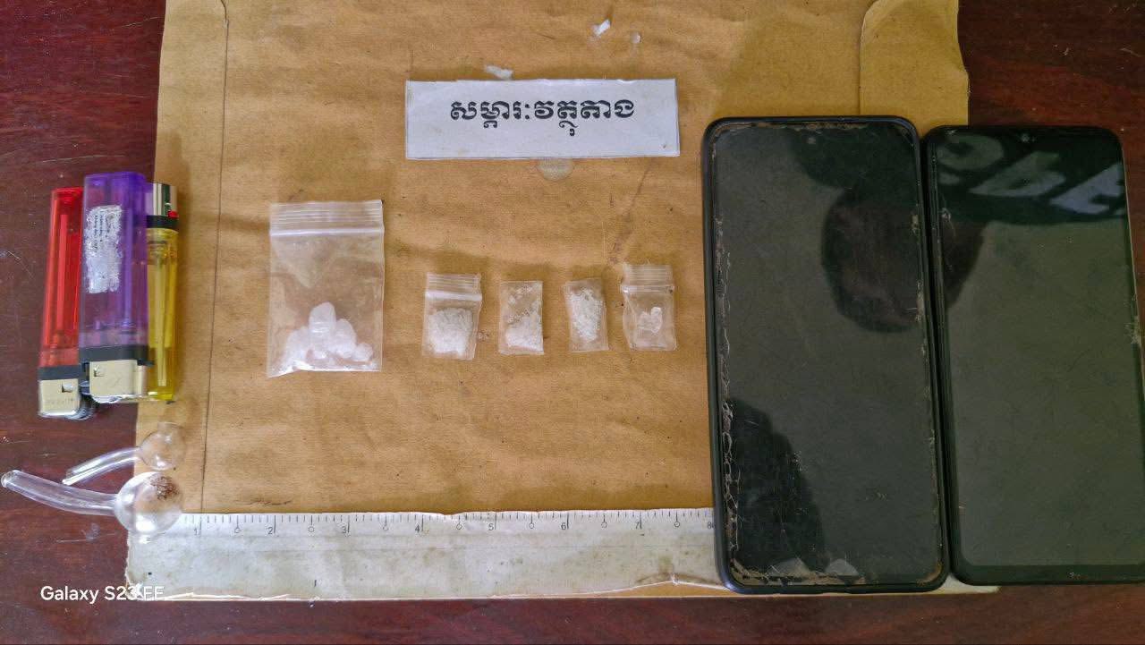 ដកហូត បានម្សៅក្រាមសថ្លាស ង្ស័ យជា គ្រឿងញៀនចំនួន៥ក ញ្ច ប់,ទូរស័ព្ទដៃចំនួន២គ្រឿង,ម៉ូតូ១គ្រឿង ឧបករណ៍ កែច្នៃសំរាប់ប្រេីប្រាស់គ្រឿងញៀនមួយចំនួន។