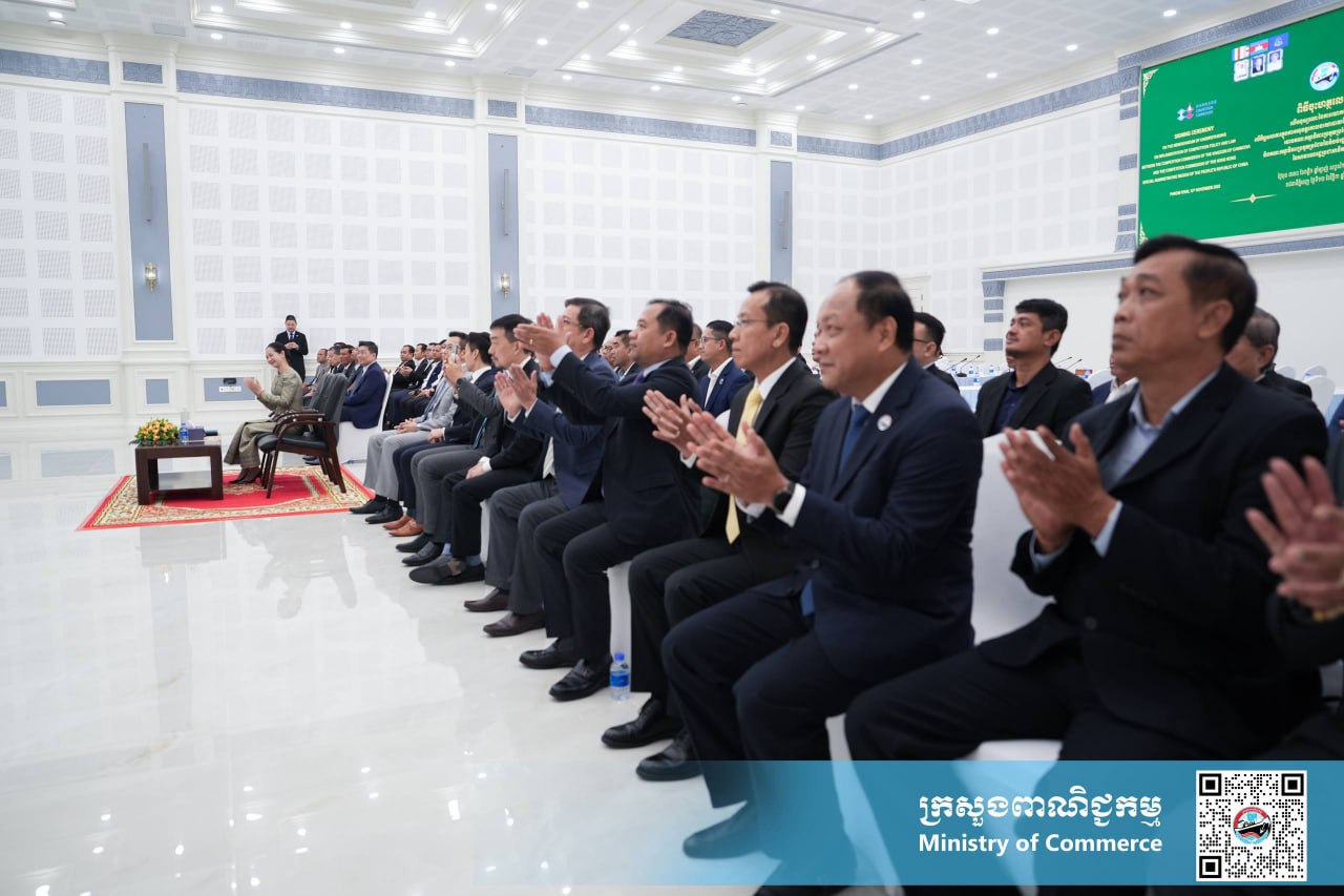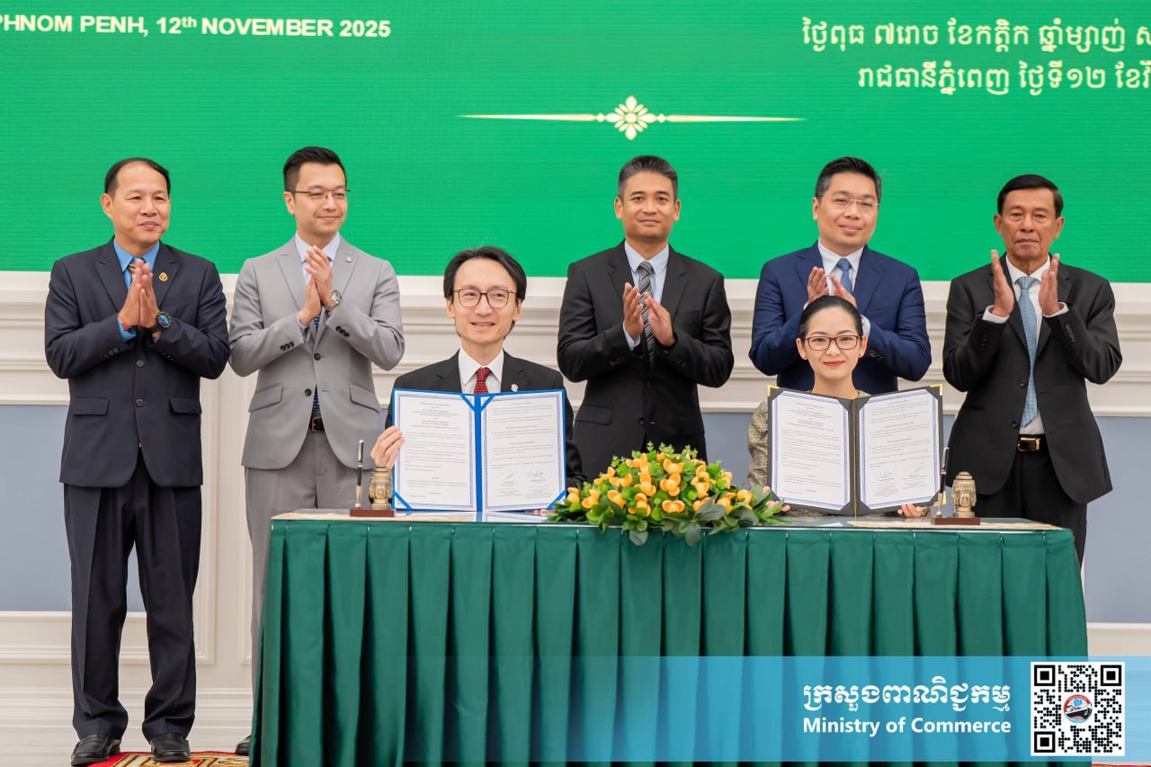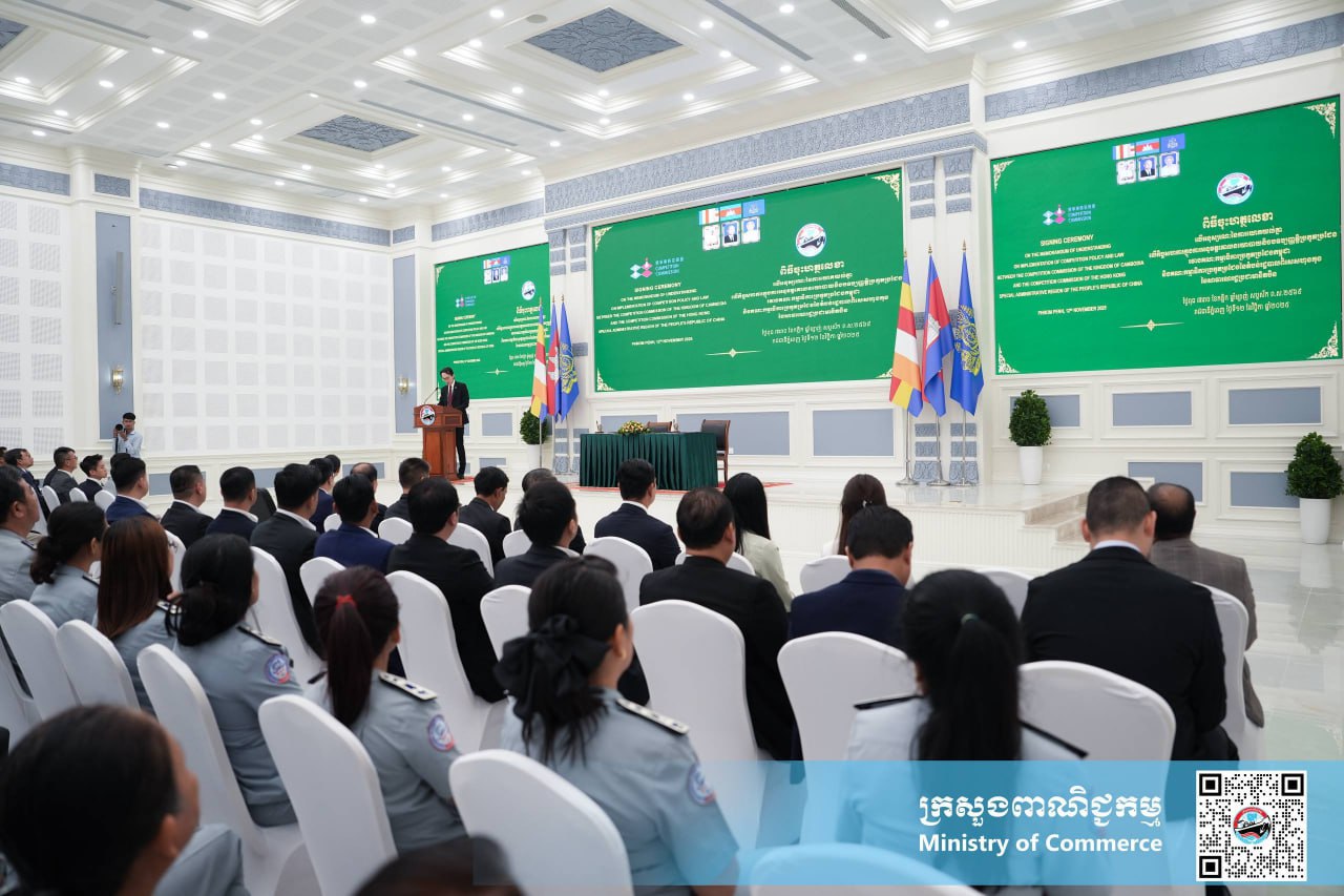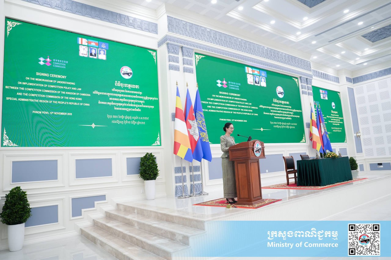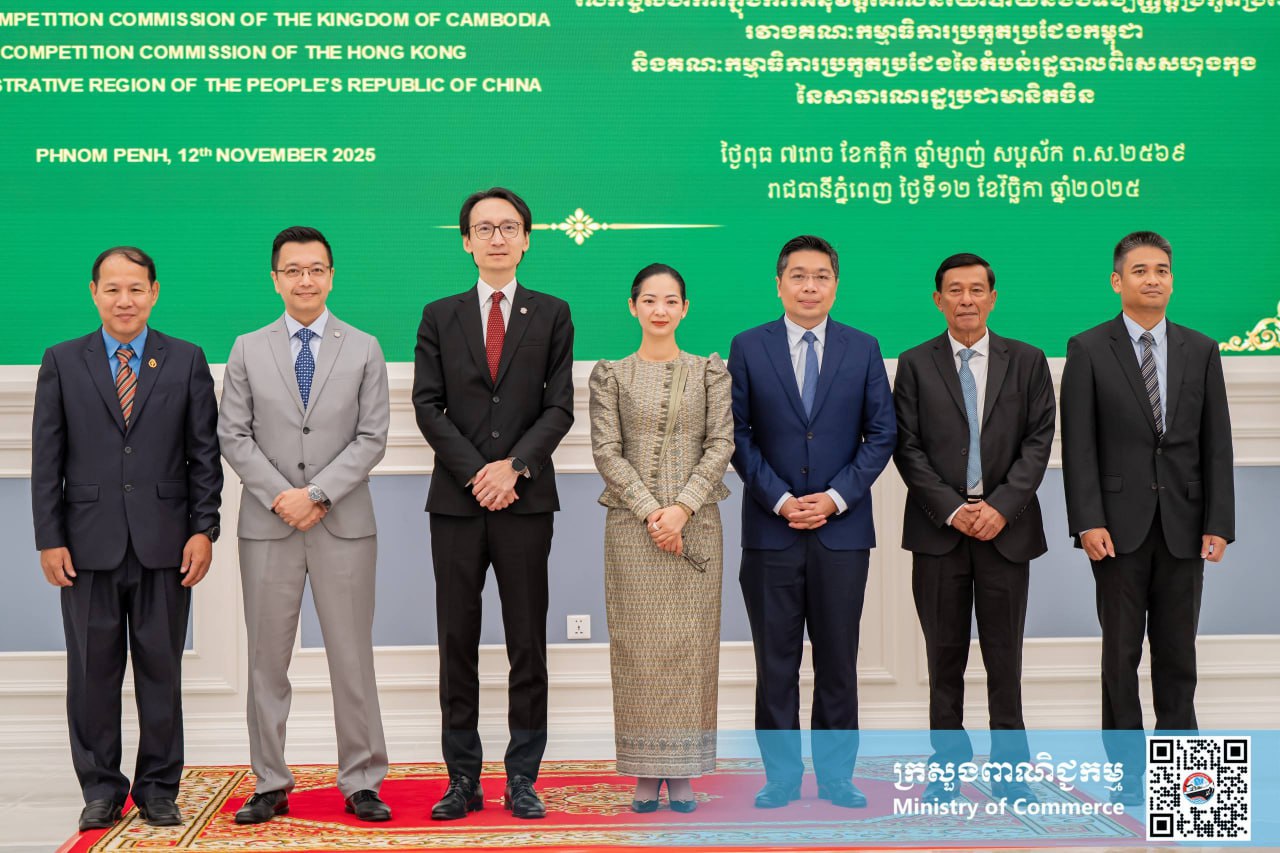 លោកជំទាវ ចម និម្មល រដ្ឋមន្ត្រីក្រសួងពាណិជ្ជកម្ម និងជាប្រធានគណៈកម្មាធិការប្រកួតប្រជែងកម្ពុជា «គ.ប.ក.» និងលោក Samuel Chan ប្រធានគណៈកម្មាធិការប្រកួតប្រជែងនៃតំបន់រដ្ឋបាលពិសេសហុងកុង «HKCC» នៃសាធារណរដ្ឋប្រជាមានិតចិន អញ្ជើញជាអធិបតី និងចុះហត្ថលេខាលើអនុស្សរណៈនៃការយោគយល់គ្នា រវាង គ.ប.ក. និង HKCC នៃសាធារណរដ្ឋប្រជាមានិតចិន លើកិច្ចសហការក្នុងការអនុវត្តគោលនយោបាយ និងច្បាប់ស្តីពីការប្រកួតប្រជែង នាព្រឹកថ្ងៃទី១២ ខែវិច្ឆិកា ឆ្នាំ២០២៥ នៅទីស្តីការក្រសួងពាណិជ្ជកម្ម រាជធានីភ្នំពេញ។