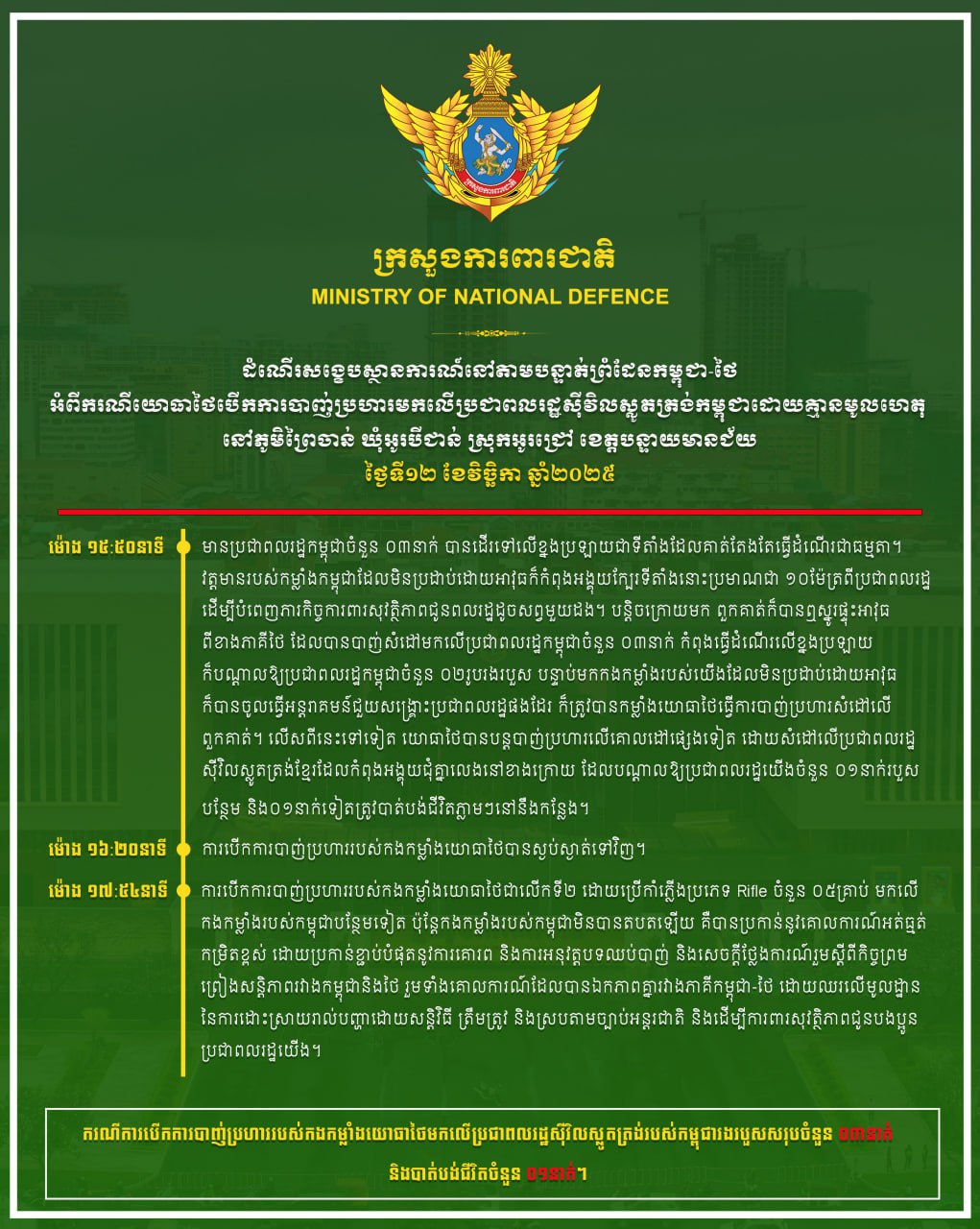 ដំណើរសង្ខេបស្ថានការណ៍នៅតាមបន្ទាត់ព្រំដែនកម្ពុជា-ថៃ អំពី ករណីយោធាថៃបើក ការបាញ់ប្រហារមកលើប្រជាពលរដ្ឋស៊ីវិលស្លូតត្រង់កម្ពុជាដោយគ្មានមូលហេតុ នៅភូមិព្រៃចាន់ ឃុំអូរបីជាន់ ស្រុកអូរជ្រៅ ខេត្តបន្ទាយមានជ័យ