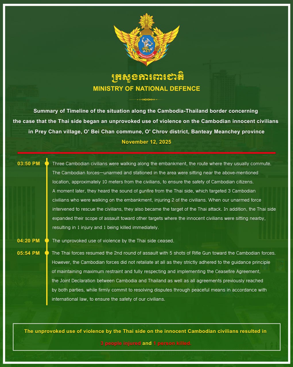 Summary of Timeline of the situation along the Cambodia-Thailand border concerning the case that the Thai side began an unprovoked use of violence on the Cambodian innocent civilians in Prey Chan village, O’ Bei Chan commune, O’ Chrov district, Banteay Meanchey province