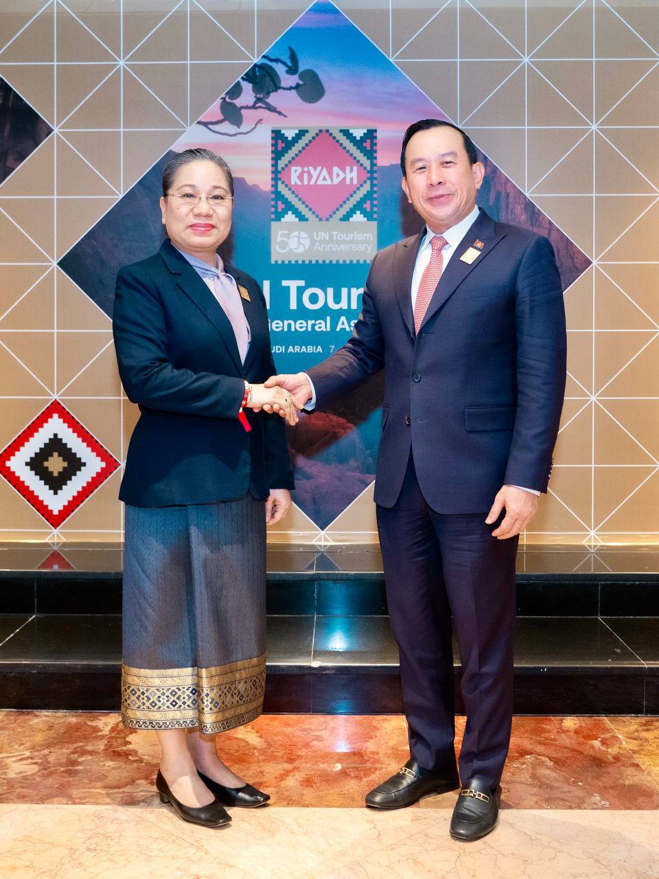 ភ្នំពេញ៖ នៅថ្ងៃទី១០ ខែវិច្ឆិកា ឆ្នាំ២០២៥ នាឱកាសដឹកនាំគណៈប្រតិភូក្រសួងទេសចរណ៍ជាន់ខ្ពស់ចូលរួមមហាសន្និបាតលើកទី២៦ នៃអង្គការទេសចរណ៍សហប្រជាជាតិ (UN Tourism- 26th General Assembly) នៅទីក្រុងរីយ៉ាដ ព្រះរាជាណាចក្រអារ៉ាប់ប៊ីសាអ៊ូឌីត ឯកឧត្តម ហួត ហាក់ រដ្ឋមន្ត្រីក្រសួងទេសចរណ៍ បានជួបពិភាក្សាការងារ និងផ្លាស់ប្តូរទស្សនៈកម្រិតខ្ពស់ជាមួយ លោកជំទាវ Suanesavanh Vignaket រដ្ឋមន្ត្រីក្រសួងវប្បធម៌ និងទេសចរណ៍នៃសាធារណរដ្ឋប្រជាធិបតេយ្យប្រជាមានិតឡាវ និងសហការី។