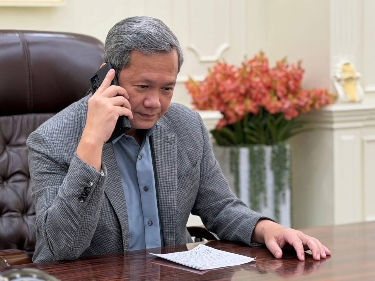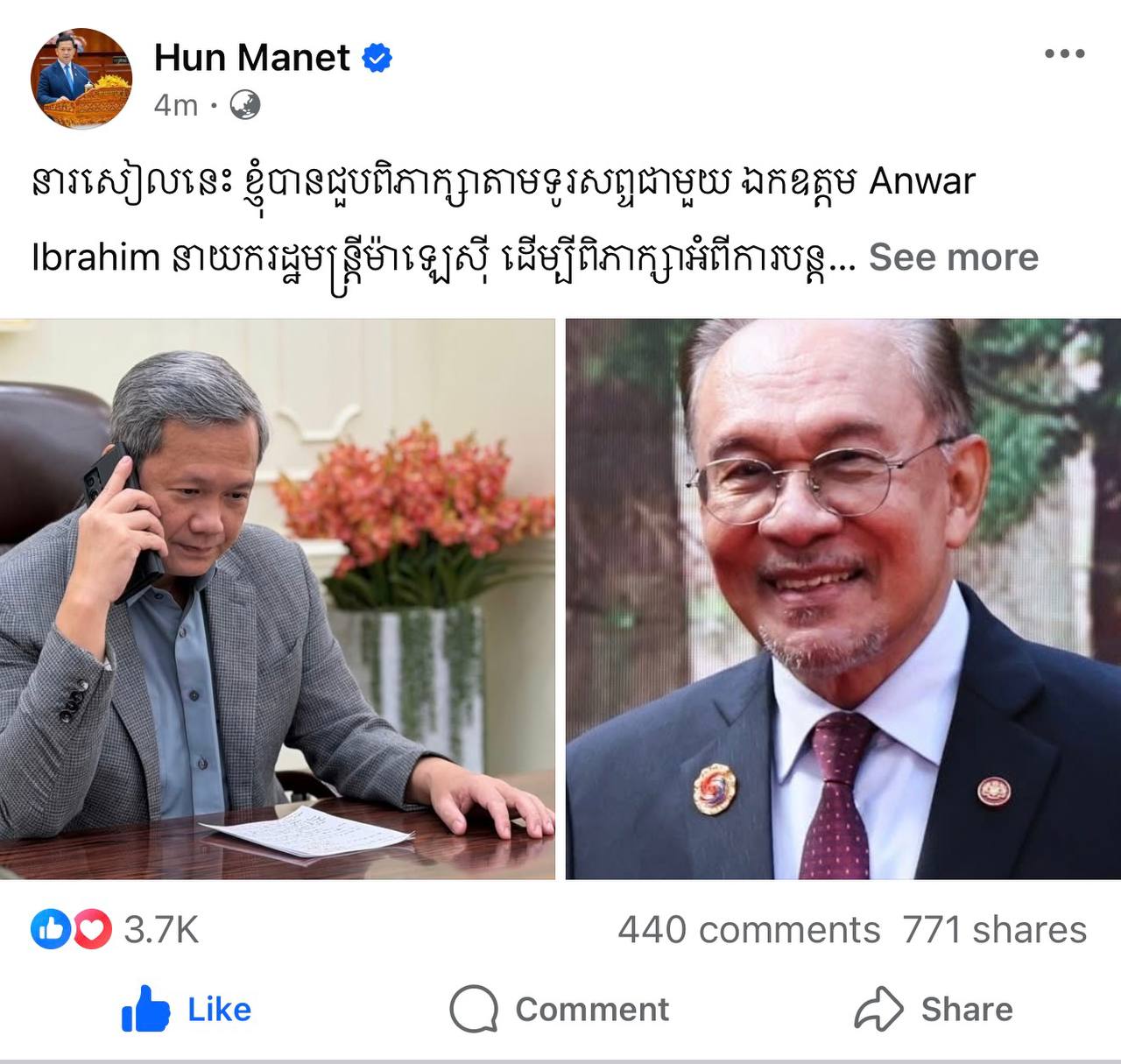 This afternoon, I had a telephone discussion with His Excellency Anwar Ibrahim, Prime Minister of Malaysia. We discussed the continued pursuit of a peaceful resolution to the Cambodia–Thailand border conflict. I expressed my sincere thanks to His Excellency Anwar for continuing to play an important and active role in facilitating and seeking a peaceful resolution between Cambodia and Thailand.