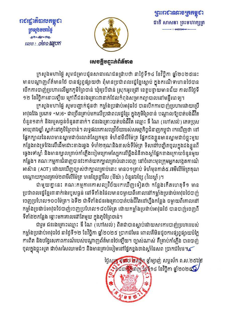 ក្រសួងមហាផ្ទៃ ចេញសេចក្តីបញ្ជាក់ព័ត៌មាន ចំពោះបណ្តាញសារព័ត៌មានថៃ ដែលបានផ្សព្វផ្សាយថា ពុំមានប្រជាពលរដ្ឋខ្មែរ ស្លាប់ ក្នុងករណីយោធាថៃ បាញ់ប្រហារលើអ្នកភូមិព្រៃចាន់ ឃុំអូរបីជាន់ ស្រុកអូរជ្រៅ ខេត្តបន្ទាយមានជ័យ កាលពីរសៀលថ្ងៃទី១២ ខែវិច្ឆិកា ឆ្នាំ២០២៥ នោះទេ!