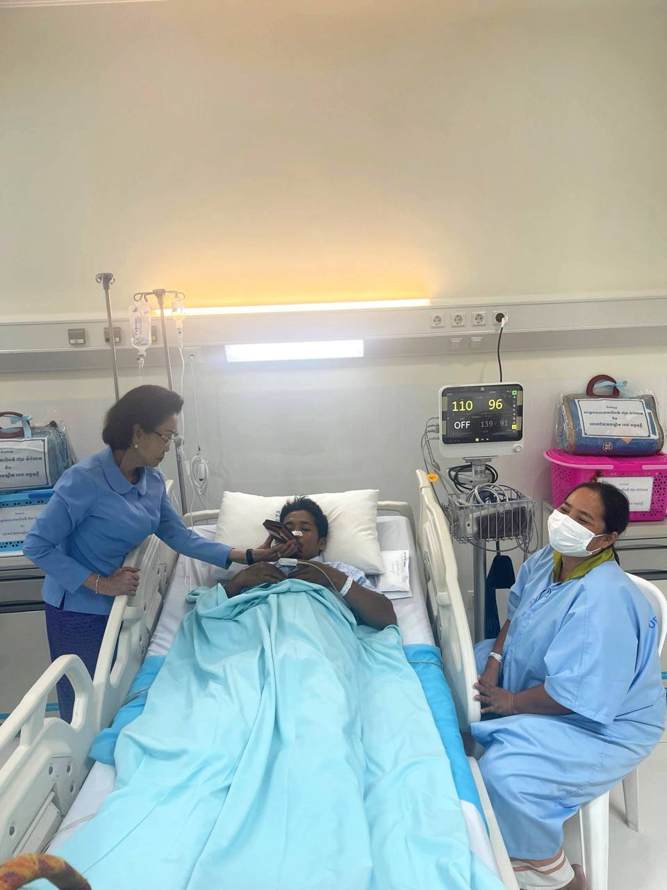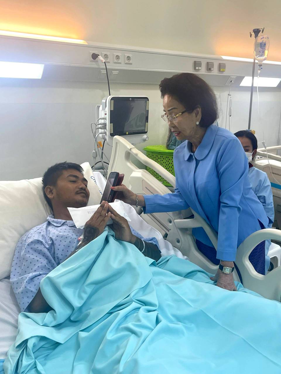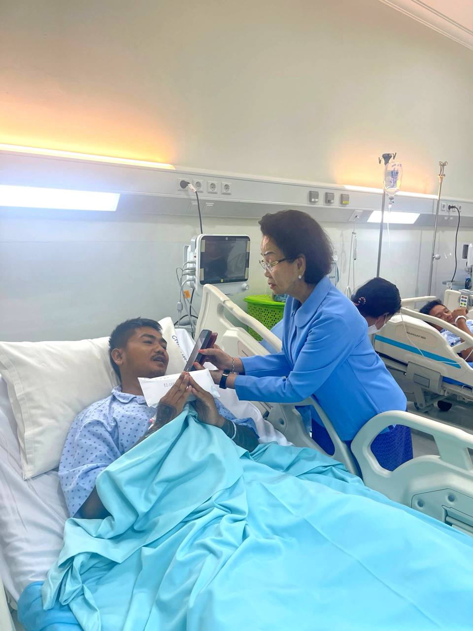 សម្ដេចកិត្ដិព្រឹទ្ធបណ្ឌិត ប៊ុន រ៉ានី ហ៊ុនសែន ជួបសំណេះសំណាលតាមទូរស័ព្ទ និងចាត់តំណាងចុះសួរសុខទុក្ខ និងនាំយកថវិកា សម្ភារៈមួយចំនួន ជូនពលរដ្ឋរងគ្រោះដោយទាហានថៃបាញ់ប្រហារ នៅភូមិព្រៃចាន់ ដែលកំពុងព្យបាលនៅមន្ទីរពេទ្យកាល់ម៉ែត