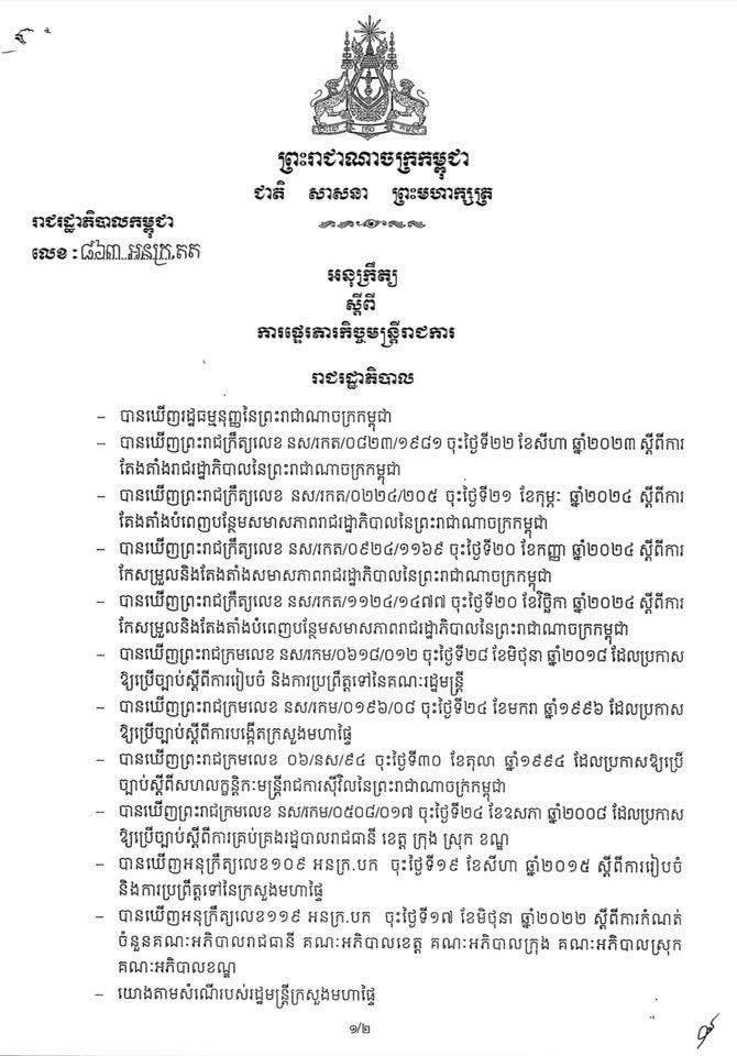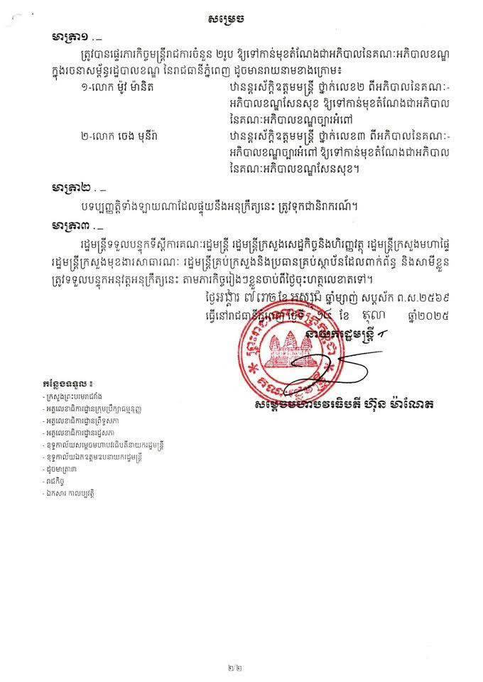 ប្រកាសផ្ទេរភារកិច្ច លោក ម៉ូវ ម៉ានិត អភិបាលខណ្ឌសែនសុខ ឱ្យទៅកាន់មុខតំណែង ជាអភិបាលខណ្ឌច្បារអំពៅ និង លោក ចេង មុនីរ៉ា អភិបាលខណ្ឌច្បារអំពៅ ឱ្យទៅកាន់មុខតំណែង ជាអភិបាលខណ្ឌសែនសុខ ៕