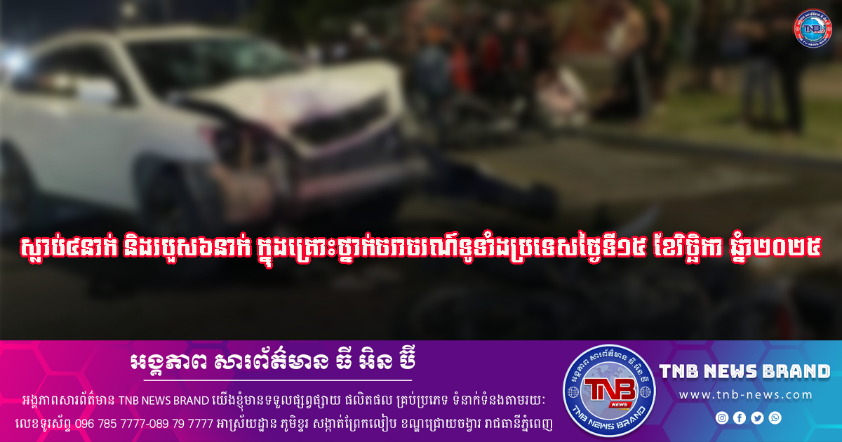 ស្លាប់៤នាក់ និងរបួស៦នាក់ ក្នុងគ្រោះថ្នាក់ចរាចរណ៍ទូទាំងប្រទេសថ្ងៃទី១៥ ខែវិច្ឆិកា ឆ្នំា២០២៥