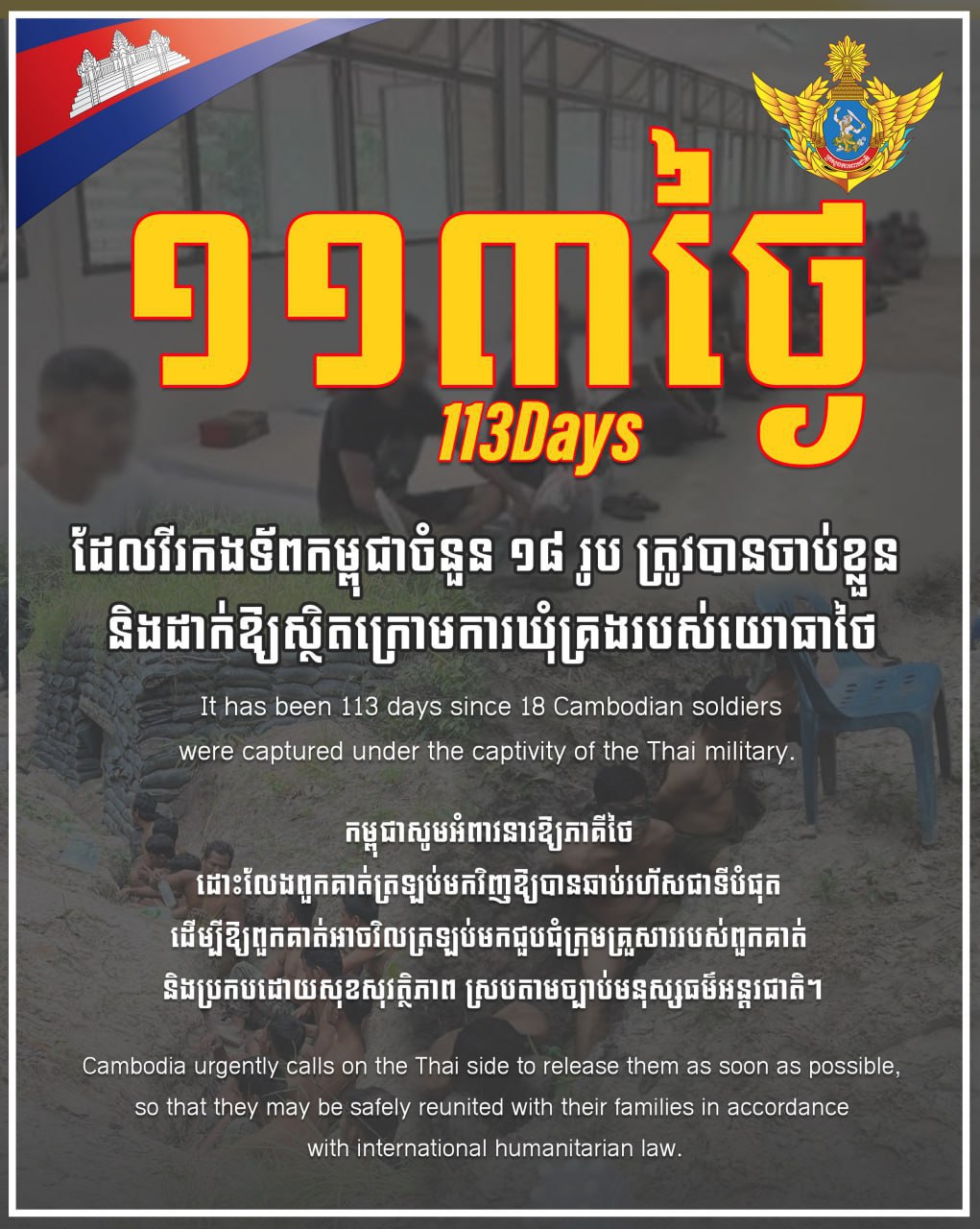 ថ្ងៃនេះជា ថ្ងៃទី១១៣ ហើយ ដែលវីរកងទ័ពកម្ពុជាចំនួន ១៨រូប ត្រូវបានចាប់ខ្លួន និងដាក់ឱ្យស្ថិតក្រោមការឃុំគ្រងរបស់យោធាថៃ