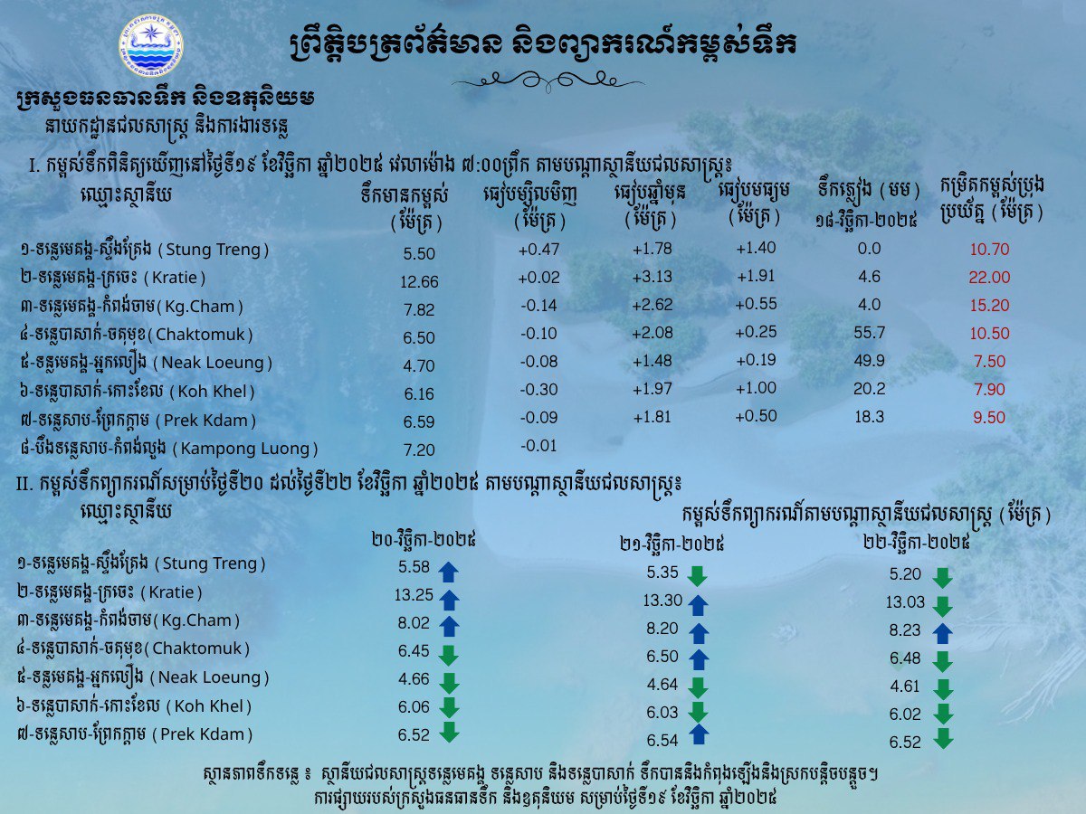 ព្រឹត្តិបត្រព័ត៌មានកម្ពស់ទឹក ម៉ោង ៧ព្រឹក ថ្ងៃទី១៩ ខែវិច្ឆិកា ឆ្នាំ២០២៥ នៅតាមបណ្ដាស្ថានីយជលសាស្ត្រ។