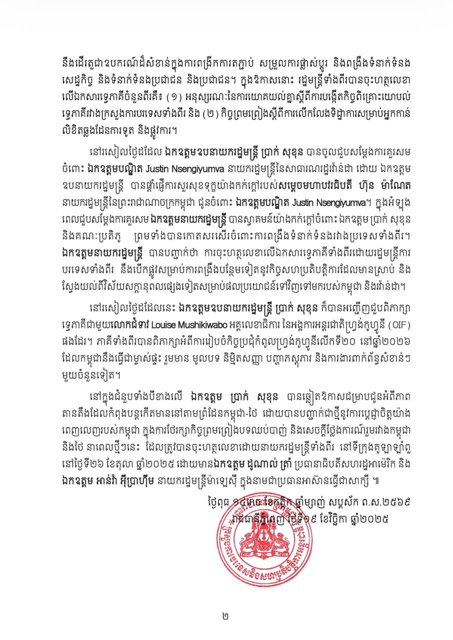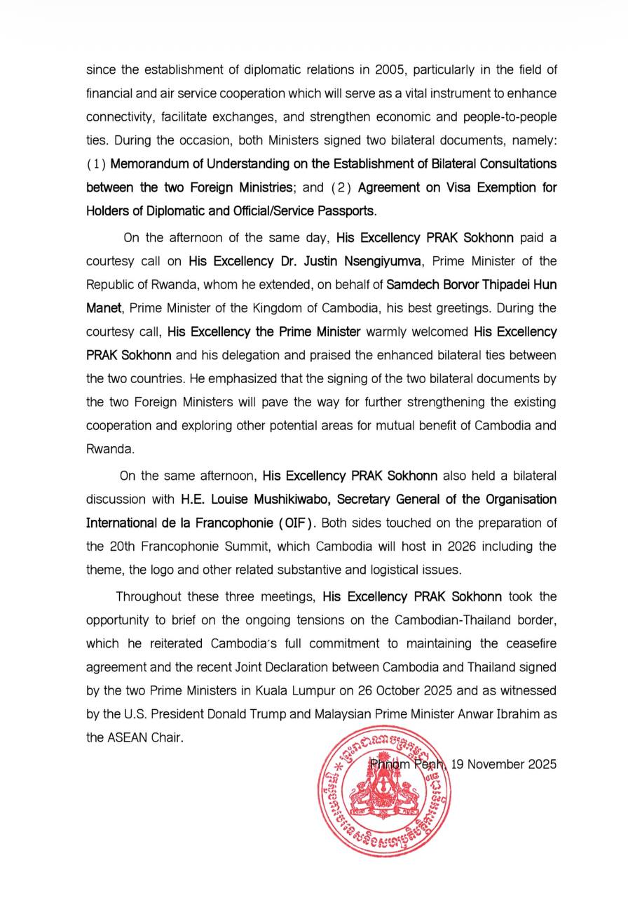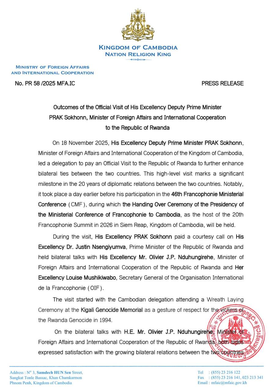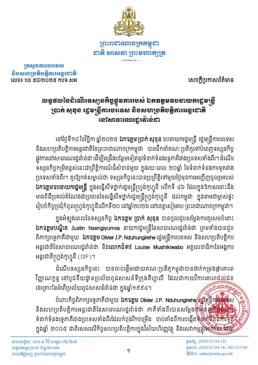 លទ្ធផលនៃដំណើរទស្សនកិច្ចផ្លូវការរបស់ ឯកឧត្តម ប្រាក់ សុខុន ឧបនាយករដ្ឋមន្ត្រី រដ្ឋមន្ត្រីការបរទេស និងសហប្រតិបត្តិការអន្តរជាតិ នៅសាធារណរដ្ឋរវ៉ាន់ដា