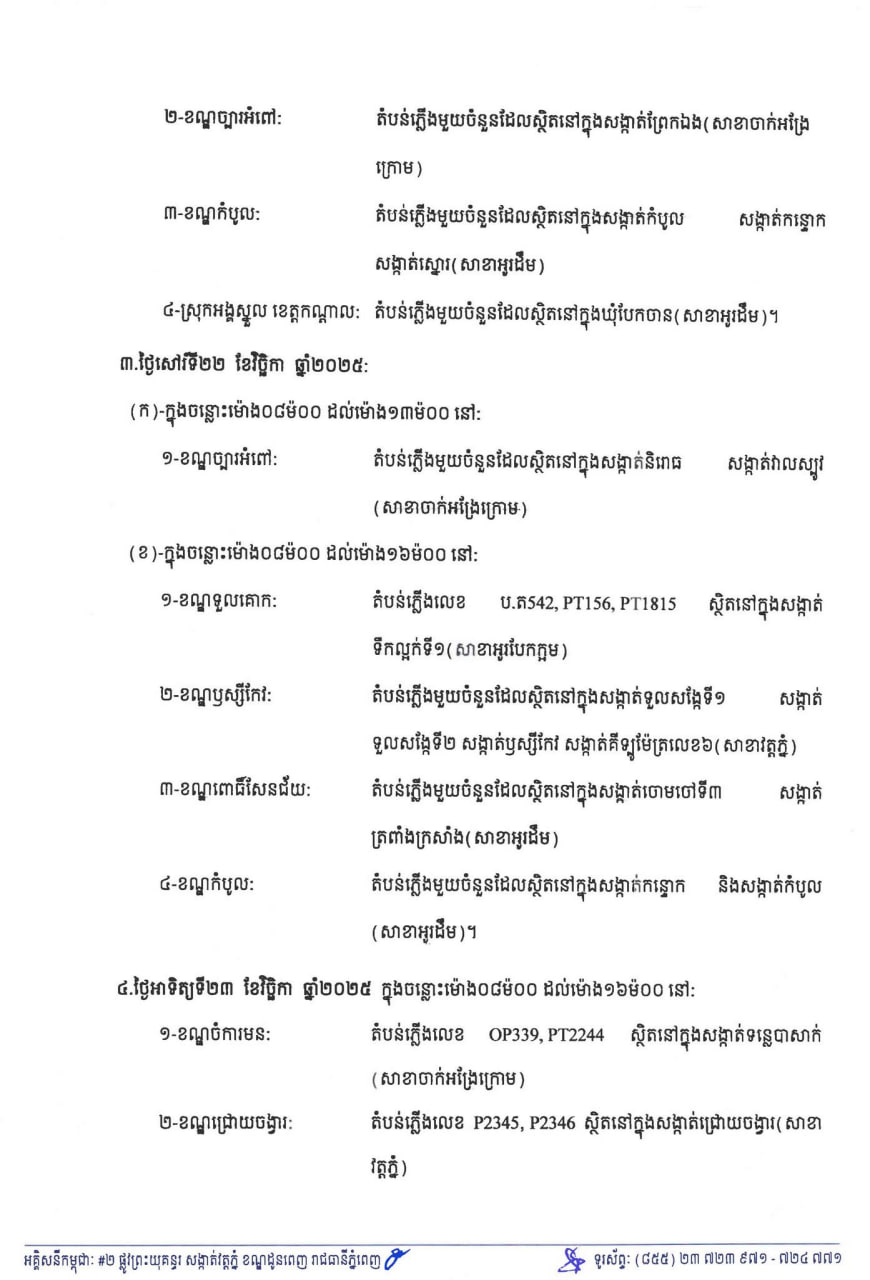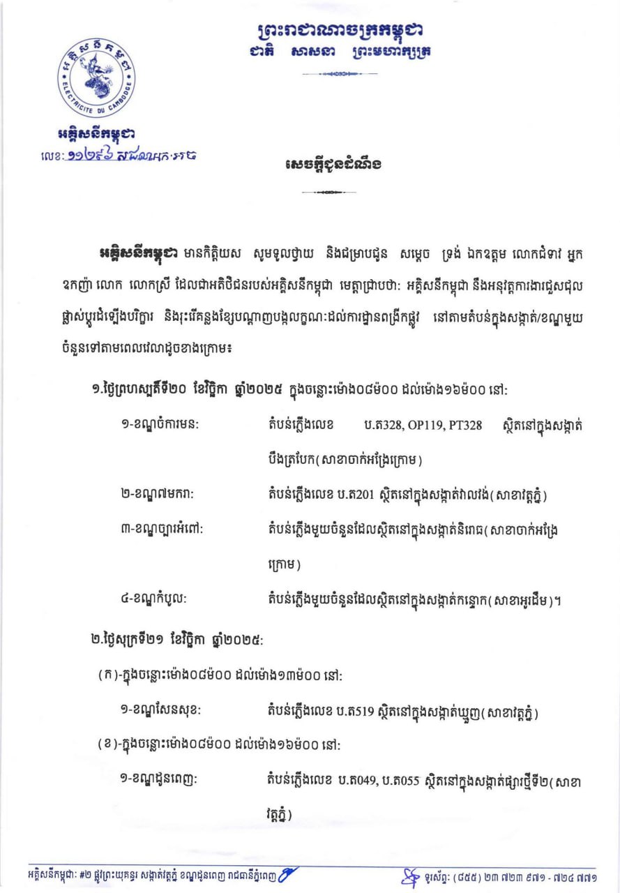 EDC ជូនដំណឹងពីការរអាក់រអួលចរន្ត តាមតំបន់សង្កាត់ខណ្ឌមួយចំនួនចាប់ពីថ្ងៃនេះ ដល់ថ្ងៃទី២៣ ខែវិច្ឆិកា ដើម្បីរុះរើគន្លងខ្សែបណ្តាញ ផ្លាស់ប្តូរ តម្លើងបរិក្ខារ ងាយស្រួលដល់ការដ្ឋានពង្រីកផ្លូវ