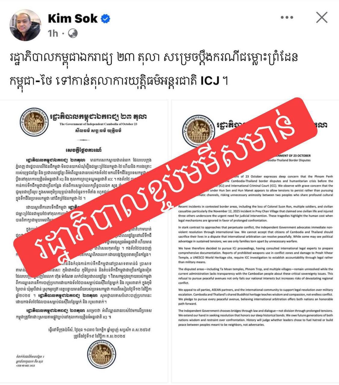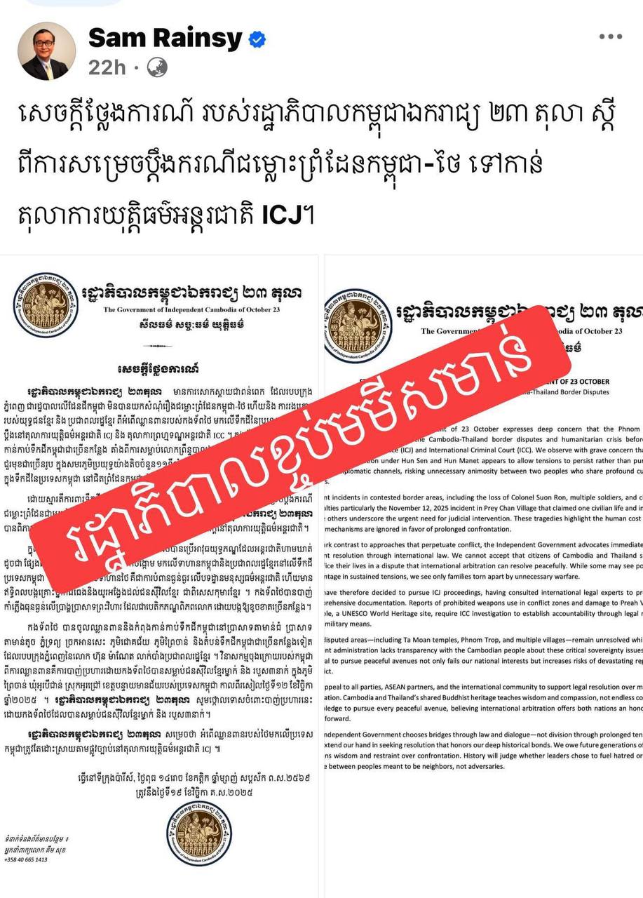 ដោយឡែកក្រុមឧទ្ទាម សម រង្សី ដែលបានបង្កើតរដ្ឋាភិបាលខ្ចប់មមីសមាន់ខុសច្បាប់ ចង់ដាក់ពាក្យបណ្តឹងទៅតុលាការយុត្តិធម៌អន្តរជាតិដែរនោះ គ្រាន់តែជាឆាកល្ខោនរៃលុយទុកចាយសម្រាប់ជីវិតចុងក្រោយតែប៉ុណ្ណោះ ។ ព្រោះថា រដ្ឋាភិបាលខ្ចប់មមីសមាន់ ជារដ្ឋាភិបាលខុសច្បាប់ ហេីយតុលាការយុត្តិធម៌អន្តរជាតិ មិនទទួលពាក្យបណ្ដឹងរបស់ រដ្ឋាភិបាលខ្ចប់មមីសមាន់ខុសច្បាប់នេះទេ ។