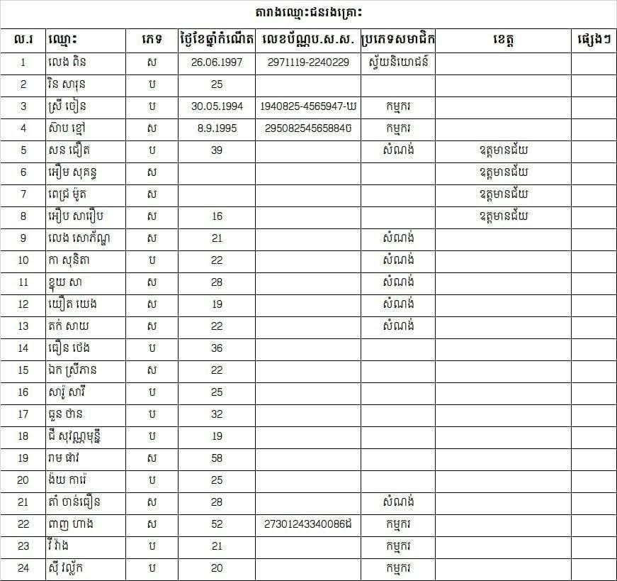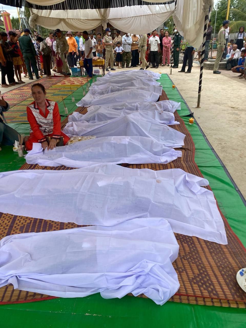 ដោយឡែក សាកសពជនរងគ្រោះក្រោយស្រង់ពីទឹក ត្រូវបានកម្លាំងសមត្ថកិច្ចយកទៅតម្កល់នៅវត្តកកោះ ឃុំកកោះ ស្រុកសន្ទុក ដើម្បីស្រាវជ្រាវរកអត្តសញ្ញាណ និង ក្រុមគ្រួសារ។ នេះជាទិដ្ឋភាពសពដែលស្រង់ចេញពីទឹក ដោយតម្កល់ដាក់តម្រៀបគ្នាគួរឱ្យស្រណោះ និង សង្វេគណាស់។ សូមចូលរួមរំលែកទុក្ខនេះផង ។ ខាងក្រោមនេះបញ្ជីឈ្មោះជនរងគ្រោះ ៖