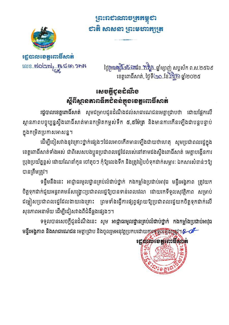 ក្នុងសេចក្តីជូនដំណឹង បានសរសេររៀបរាប់ថា រដ្ឋបាលខេត្តពោធិ៍សាត់ សូមជម្រាបជូនដំណឹងដល់សាធារណជនមេត្តាជ្រាបថា ដោយផ្អែកលើស្ថានភាពបច្ចុប្បន្នស្ទឹងពោធិ៍សាត់ មានកម្រិតកម្ពស់ទឹក ៥,៥ម៉ែត្រ និងមានការកើនឡើងជាបន្តបន្ទាប់ ក្នុងកម្រិតប្រកាសអាសន្ន។