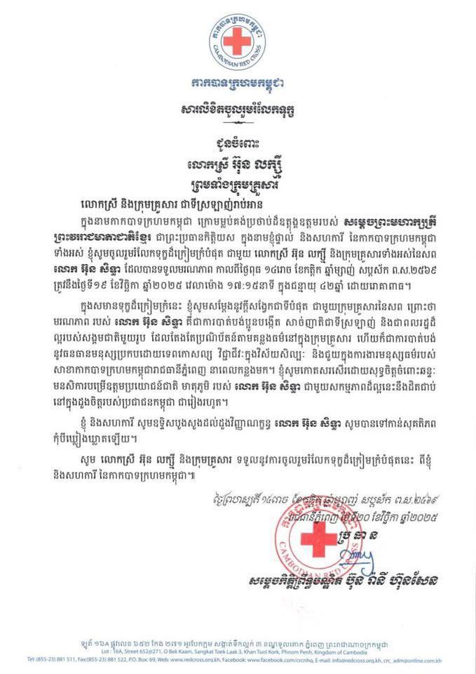 សម្តេចកិត្តិព្រឹទ្ធបណ្ឌិត ប៊ុន រ៉ានី ហ៊ុនសែន ប្រធានកាកបាទក្រហមកម្ពុជា នៅរសៀលថ្ងៃព្រហស្បតិ៍ ទី២០ ខែវិច្ឆិកា ឆ្នាំ២០២៥ នេះ បានចាត់ឱ្យលោកជំទាវ ហួន ចន្ទបូរ៉ា នាយិកា នាយកដ្ឋានទំនាក់ទំនង កាកបាទក្រហមកម្ពុជា និងសហការី អញ្ជើញនាំយកនូវសម្ភាររួមជាមួយថវិកាមួយចំនួន ចូលរួមរំលែកមរណទុក្ខដ៏ក្រៀមក្រំបំផុតជាមួយលោកស្រី អ៊ុន លក្ស្មី និងក្រុមគ្រួសារទាំងអស់នៃសពលោក អ៊ុន សិទ្ធា ដែលបានទទួលមរណភាព