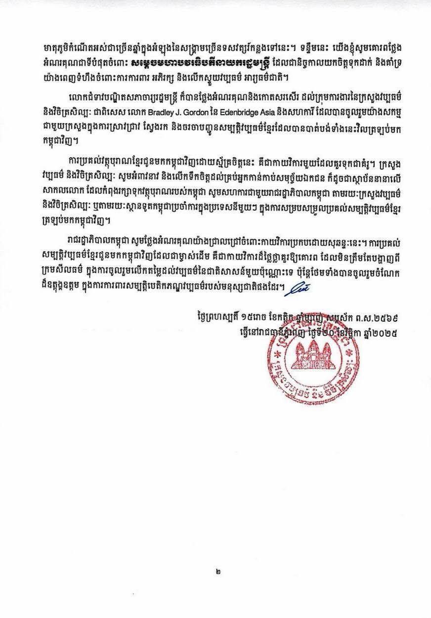 សម្ដេចធិបតី ហ៊ុន ម៉ាណែត នាយករដ្ឋមន្ត្រីនៃកម្ពុជា សូមអបអរសាទរ និងស្វាគមន៍រតនវត្ថុសិល្បៈខ្មែរ មាតុភូមិនិវត្តន៍មកកម្ពុជាវិញ!