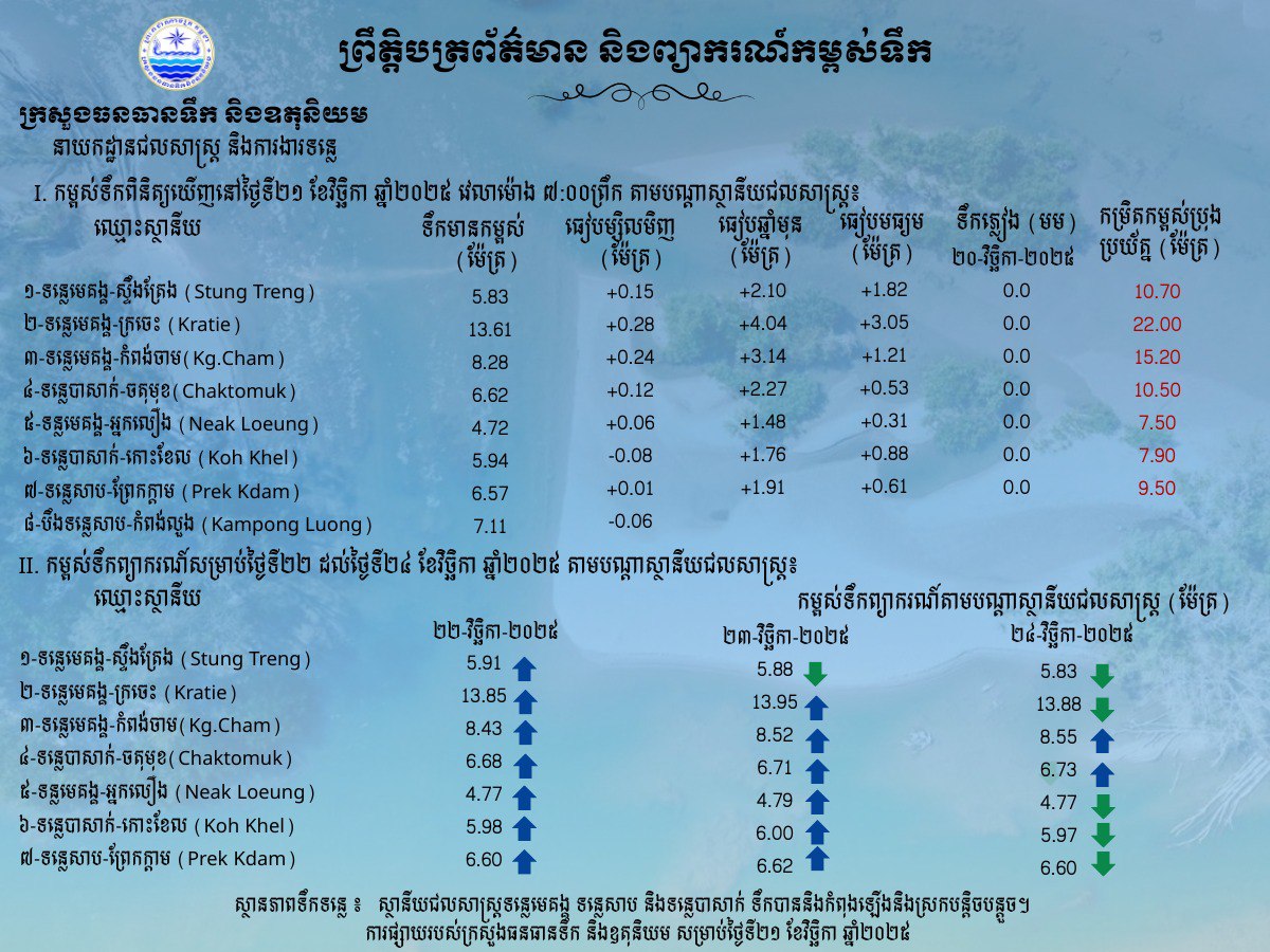 ព្រឹត្តិបត្រព័ត៌មានកម្ពស់ទឹក ម៉ោង ៧ព្រឹក ថ្ងៃទី២១ ខែវិច្ឆិកា ឆ្នាំ២០២៥ នៅតាមបណ្ដាស្ថានីយជលសាស្ត្រ។