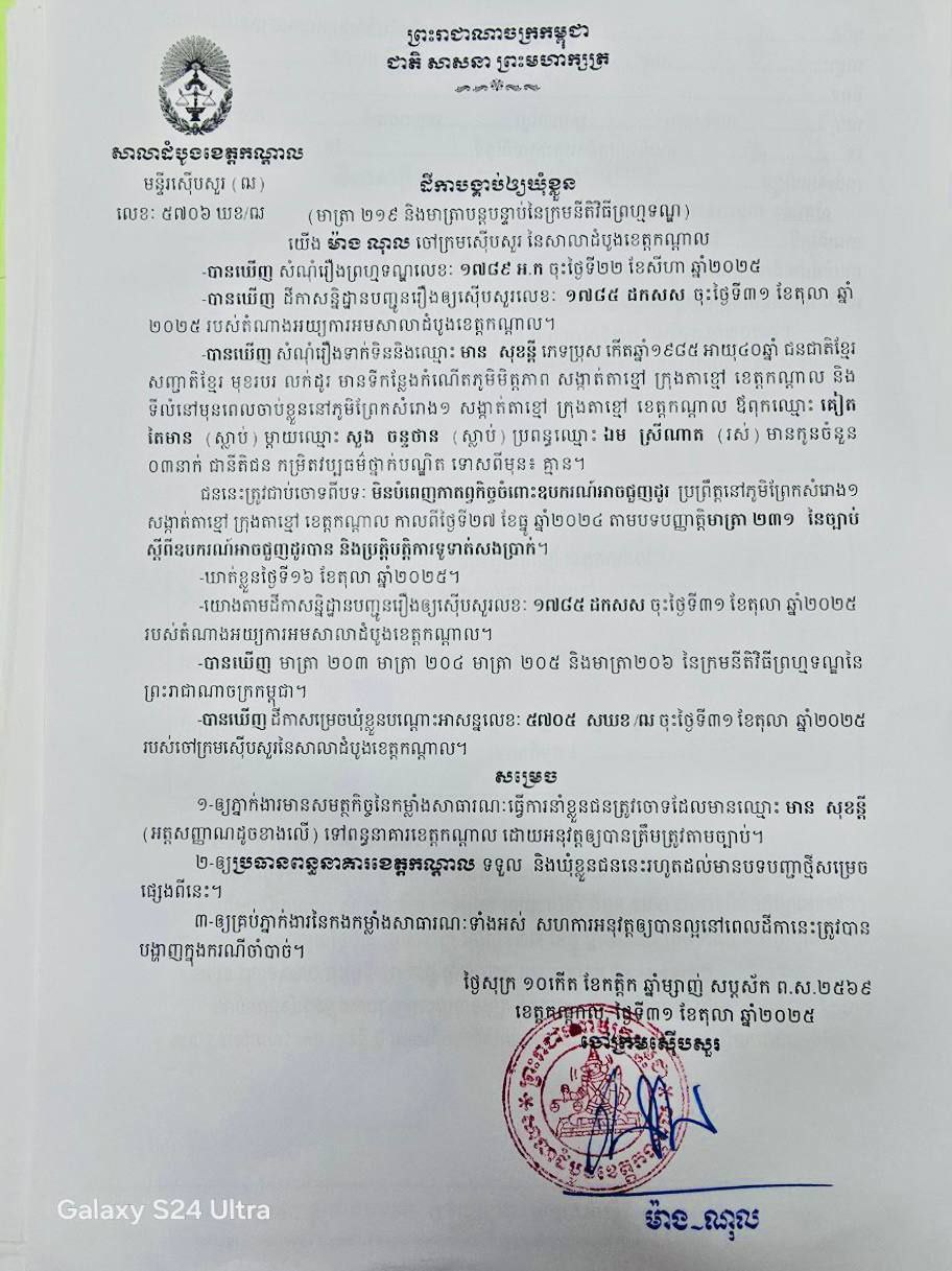 បើយោងតាមដីកាសន្និដ្ឋានបញ្ជូនរឿងឲ្យស៊ើបសួរលខ៖ ១៧៨៥ ដកសស ចុះថ្ងៃទី៣១ ខែតុលា ឆ្នាំ២០២៥ របស់តំណាងអយ្យការអមសាលាដំបូងខេត្តកណ្តាល ឲ្យភ្នាក់ងារមានសមត្ថកិច្ចនៃកម្លាំងសាធារណៈ ធ្វើការនាំខ្លួនជនត្រូវចោទដែលមានឈ្មោះ មាន សុខន្តី ទៅពន្ធនាគារខេត្តកណ្តាល ដោយអនុវត្តតាមនីតិវិធីច្បាប់ រហូតដល់មានបទបញ្ជាថ្មីសម្រេច៕