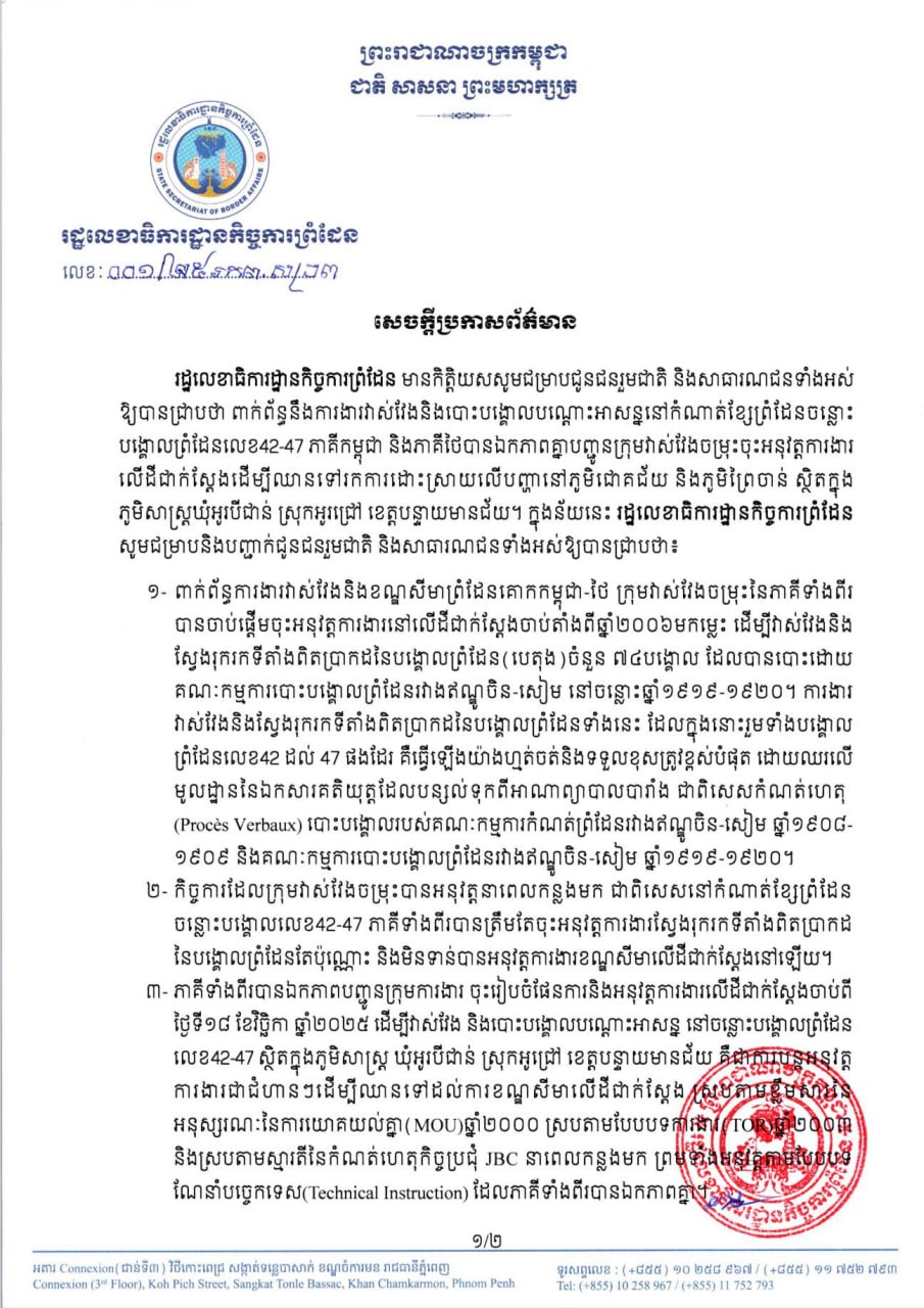 រដ្ឋលេខាធិការដ្ឋានកិច្ចការព្រំដែន នៅថ្ងៃទី២១ ខែវិច្ឆិកា ឆ្នាំ២០២៥ នេះ បានចេញ សេចក្តីប្រកាសព័ត៌មាន ពាក់ព័ន្ធនឹងការងារវាស់វែង និងបោះបង្គោលបណ្តោះអាសន្ននៅកំណាត់ខ្សែព្រំដែនចន្លោះ បង្គោលព្រំដែនលេខ 42-47 ដោយ ភាគីកម្ពុជា និងភាគីថៃបានឯកភាពគ្នាបញ្ជូនក្រុមវាស់វែងចម្រុះចុះអនុវត្តការងារ លើដីជាក់ស្ដែងដើម្បីឈានទៅរកការដោះស្រាយលើបញ្ហានៅភូមិជោគជ័យ និងភូមិព្រៃចាន់ ស្ថិតក្នុង ភូមិសាស្ត្រឃុំអូរបីជាន់ ស្រុកអូរជ្រៅ ខេត្តបន្ទាយមានជ័យ។