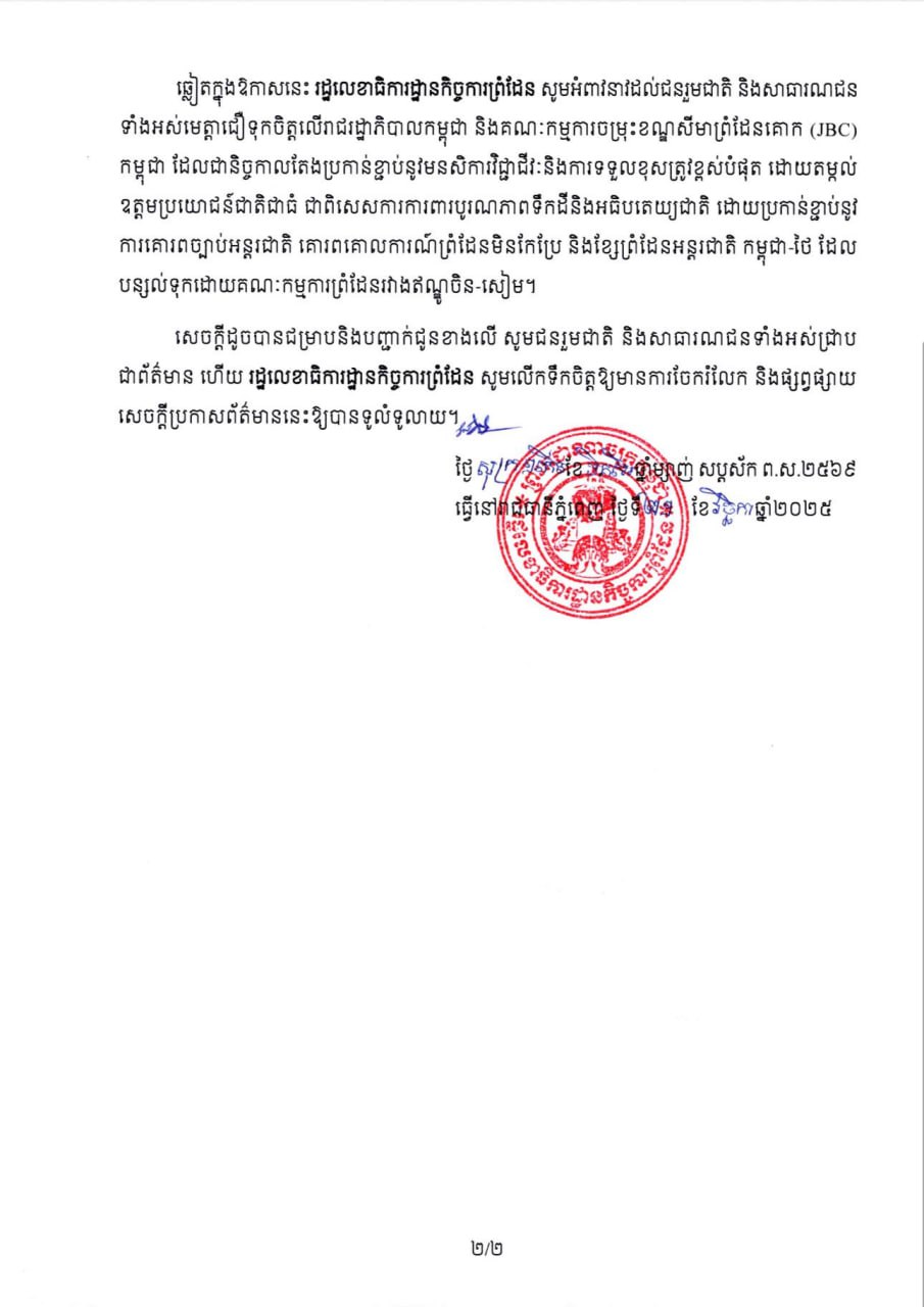 ឆ្លៀតក្នុងឱកាសនេះ រដ្ឋលេខាធិការដ្ឋានកិច្ចការព្រំដែន សូមអំពាវនាវដល់ជនរួមជាតិ និងសាធារណជន ទាំងអស់មេត្តាជឿទុកចិត្តលើរាជរដ្ឋាភិបាលកម្ពុជា និងគណៈកម្មការចម្រុះខណ្ឌសីមាព្រំដែនគោក (JBC) កម្ពុជា ដែលជានិច្ចកាលតែងប្រកាន់ខ្ជាប់នូវមនសិការវិជ្ជាជីវៈ និងការទទួលខុសត្រូវខ្ពស់បំផុត ដោយតម្កល់ ឧត្តមប្រយោជន៍ជាតិជាធំ ជាពិសេសការការពារបូរណភាពទឹកដី និងអធិបតេយ្យជាតិ ដោយប្រកាន់ខ្ជាប់នូវ ការគោរពច្បាប់អន្តរជាតិ គោរពគោលការណ៍ព្រំដែនមិនកែប្រែ និងខ្សែព្រំដែនអន្តរជាតិ កម្ពុជា-ថៃ ដែលបន្សល់ទុកដោយគណៈកម្មការព្រំដែនរវាងឥណ្ឌូចិន-សៀម៕