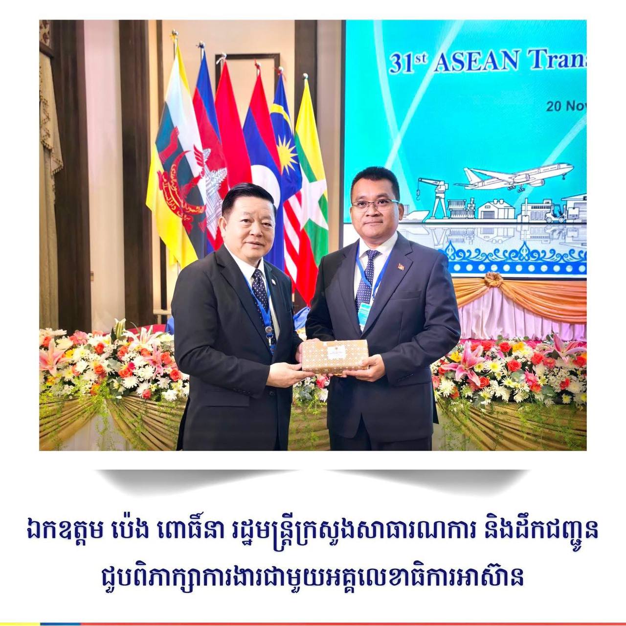 លោករដ្ឋមន្រ្តី ប៉េង ពោធិ៍នា បានថ្លែងអំណរគុណដល់លេខាធិការដ្ឋានអាស៊ាន ដែលបានដើរតួនាទីដ៏សំខាន់ក្នុងការសម្របសម្រួលជំរុញការលើកកម្ពស់ស្តង់ដារដឹកជញ្ជូនក្នុងតំបន់ និងបានស្នើឱ្យអគ្គលេខាធិការ បន្តជួយជំរុញកិច្ចសហប្រតិបត្តិការក្នុងតំបន់លើគ្រប់វិស័យ ពិសេសវិស័យដឹកជញ្ជូន ដើម្បីផ្តល់ផលប្រយោជន៍ជាអតិបរមាជូនប្រជាជនកម្ពុជា ក៏ដូចជាប្រជាជនក្នុងតំបន់៕